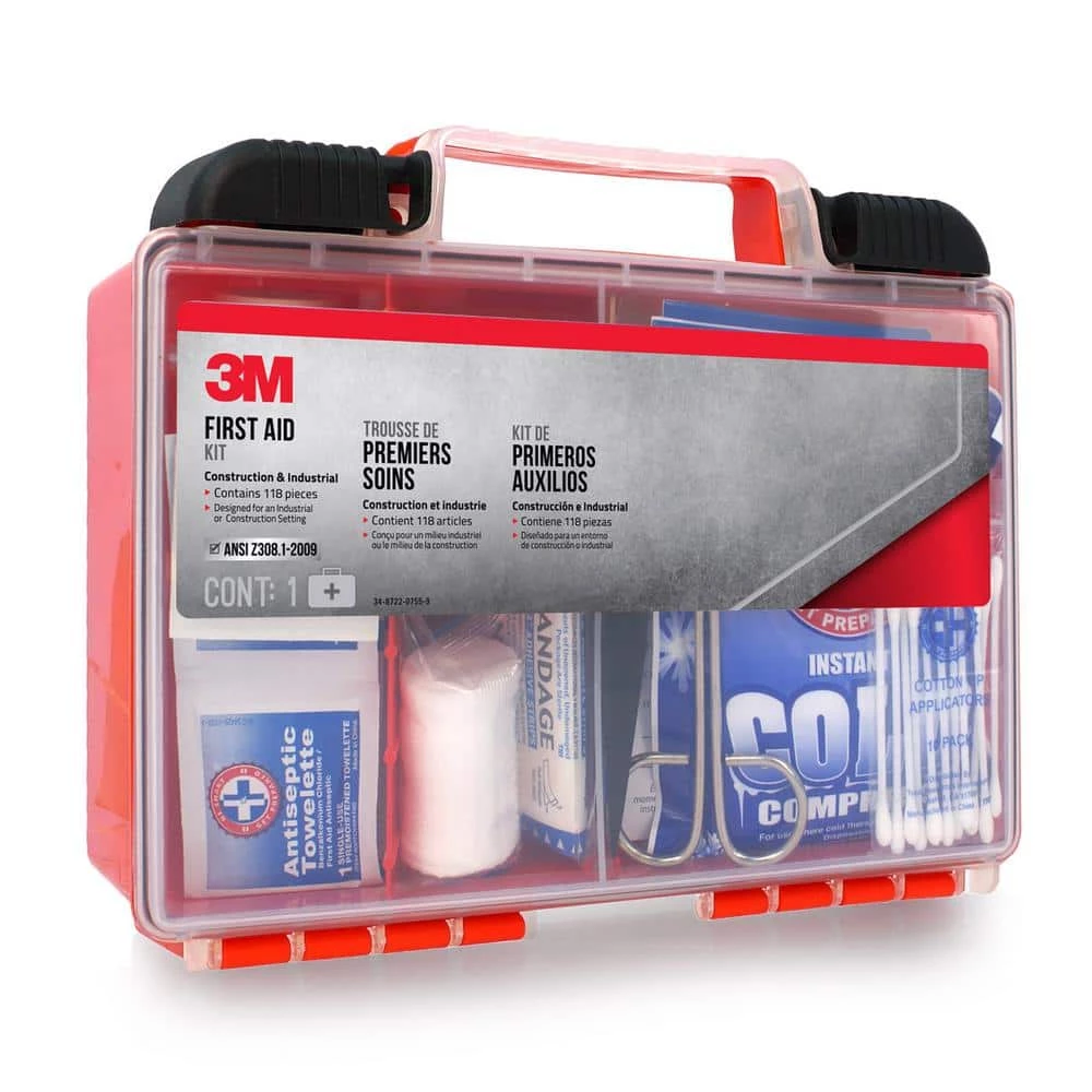 The 3M First Aid Kit for Construction and Industrial is designed to address minor injuries on the job. Equipped with bandages, tweezers, ointments, a cold compress and more, this first aid kit offers a comprehensive array of essentials to help get you and your crew on the mend. The handy case helps keep all your items organized and accessible, and the built in handle makes it easy to transport the kit from one job site to the next. Preparedness is a key part of the jobÂ-so always be one step ahead when it comes to the safety and well being of your crew with the help of the 3M First Aid Kit.