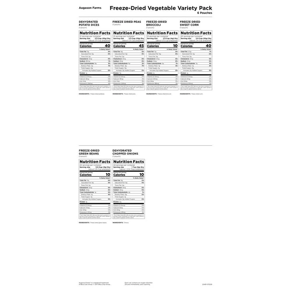 - Includes freeze dried vegetables: peas (15 servings), potato dices (15 servings), sweet corn (20 servings), broccoli florets and stems (15 servings), green beans (20 servings)