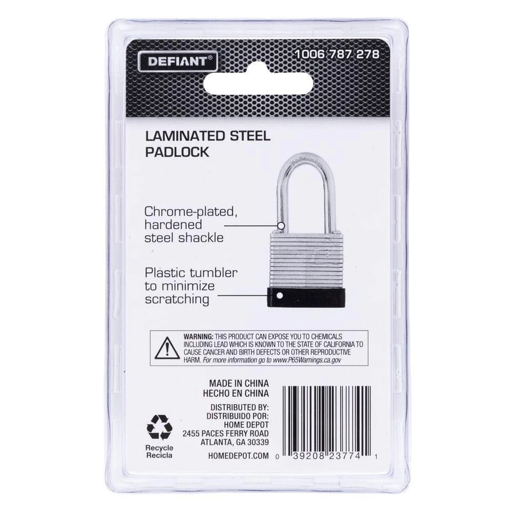 The Defiant Laminated Steel Padlock features a 30 mm body and a 1 in. chrome-plated, hardened steel shackle for increased cut resistance. It is equipped with 4 brass pin cylinders for optimal pick and pry resistance and dual lever locking mechanism for maximum security. The padlock is designed with a form-fitted plastic bumper to reduce scratching and marring. The superior corrosion resistance makes this padlock perfect for indoor and outdoor use to secure storage units, chains, trailers, gates and utility boxes.