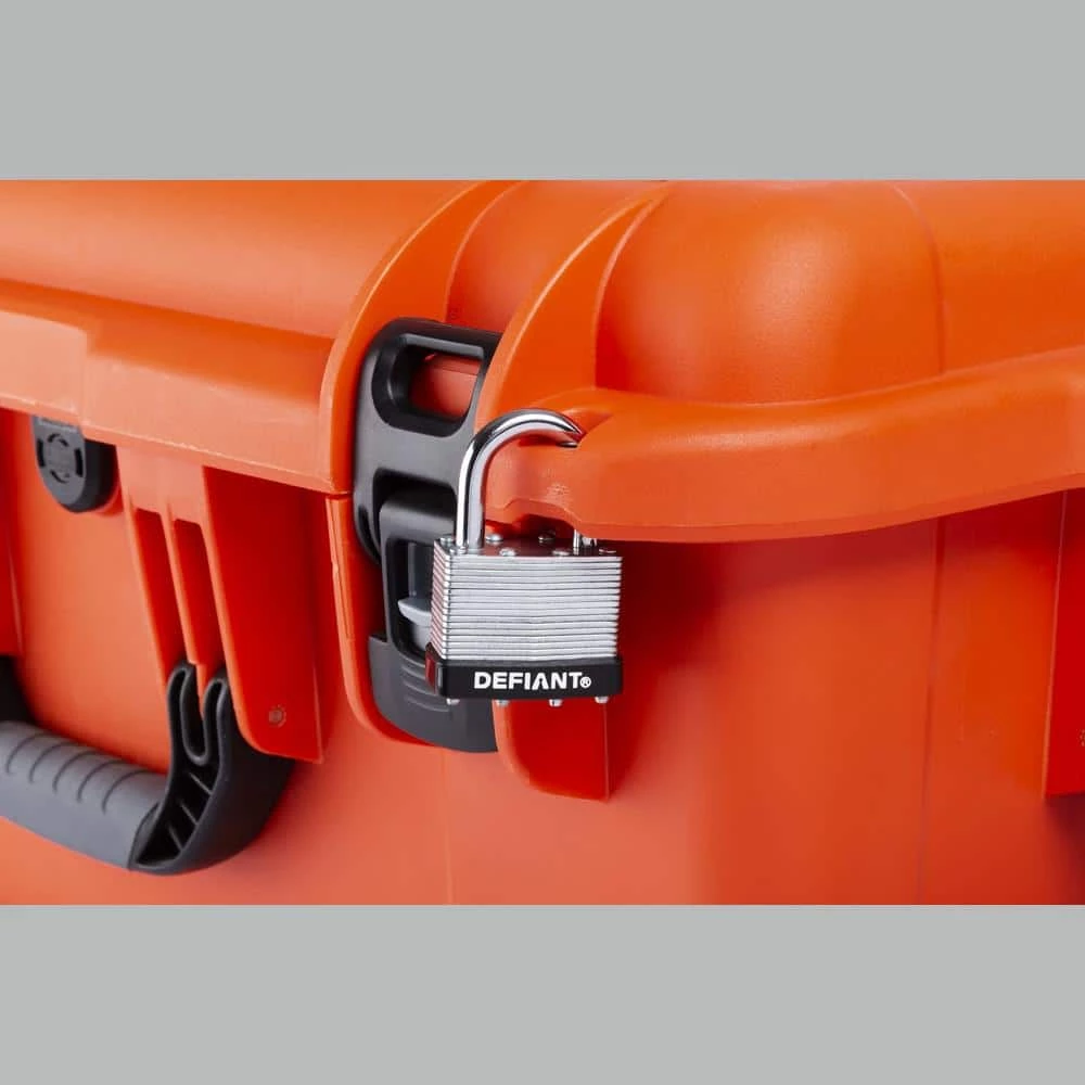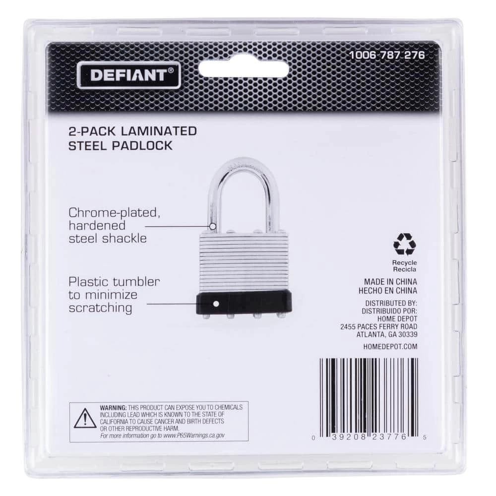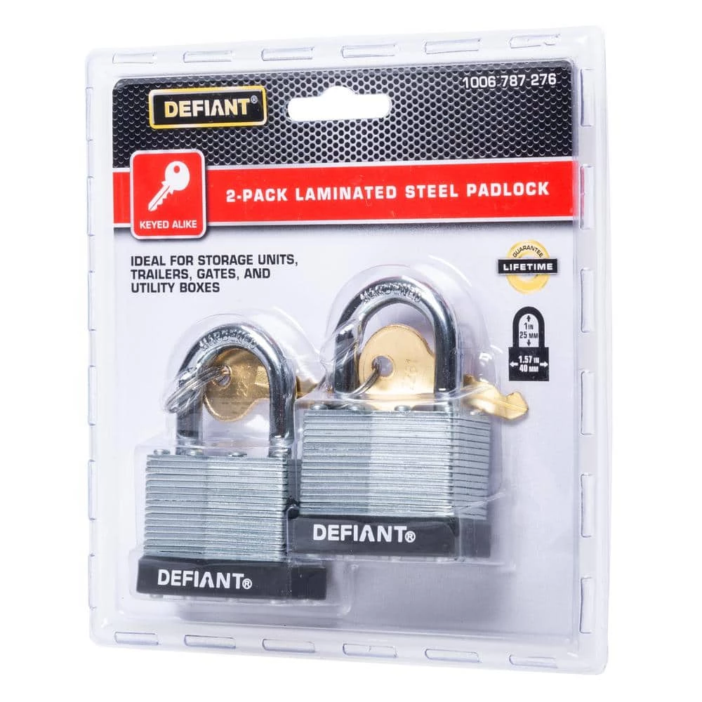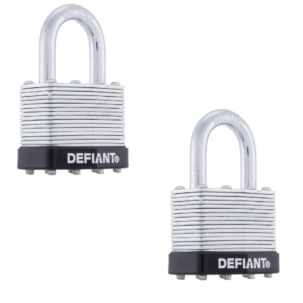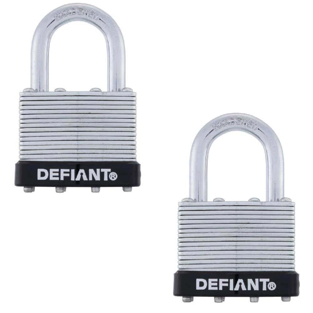 The Defiant Laminated Steel Padlock features a 40 mm body and a 1 in. chrome-plated, hardened steel shackle for increased cut resistance. It is equipped with 4 brass pin cylinders for optimal pick and pry resistance and dual lever locking mechanism for maximum security. The padlock is designed with a form-fitted plastic bumper to reduce scratching and marring. The superior corrosion resistance makes this padlock perfect for indoor and outdoor use to secure storage units, chains, trailers, gates, and utility boxes.