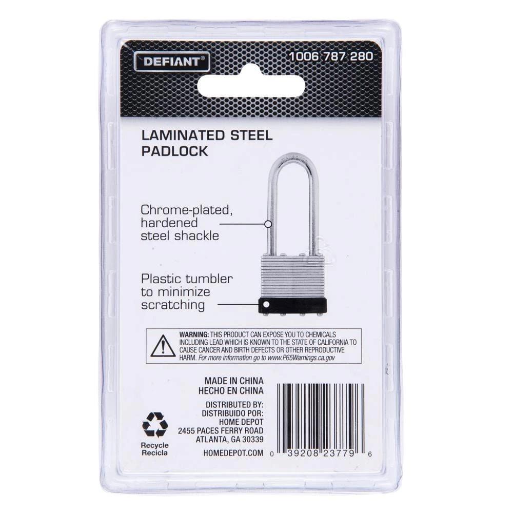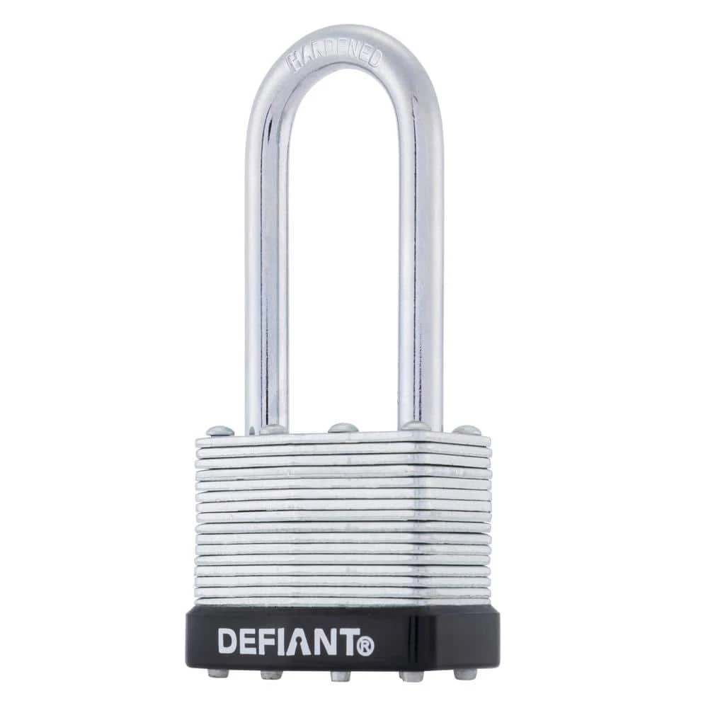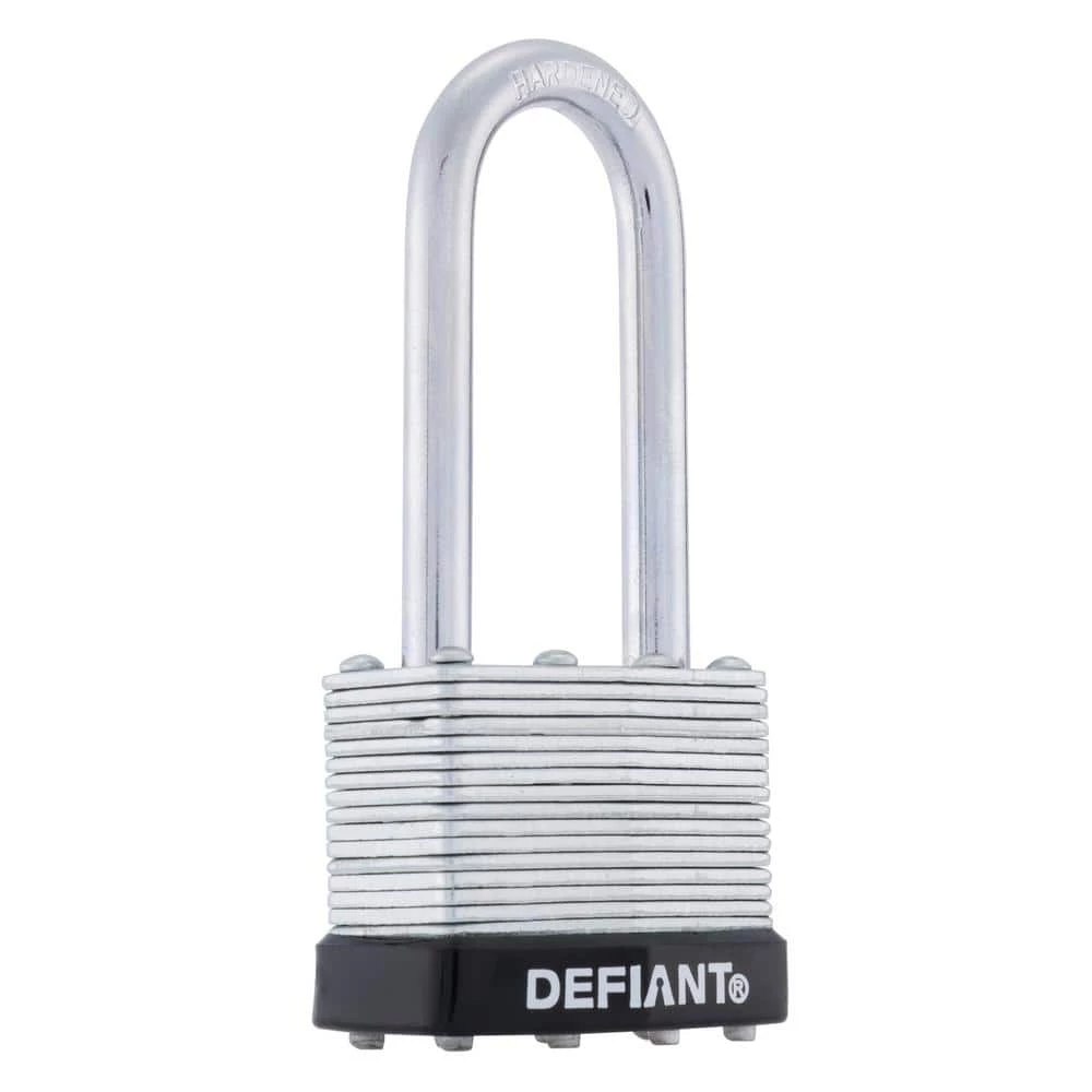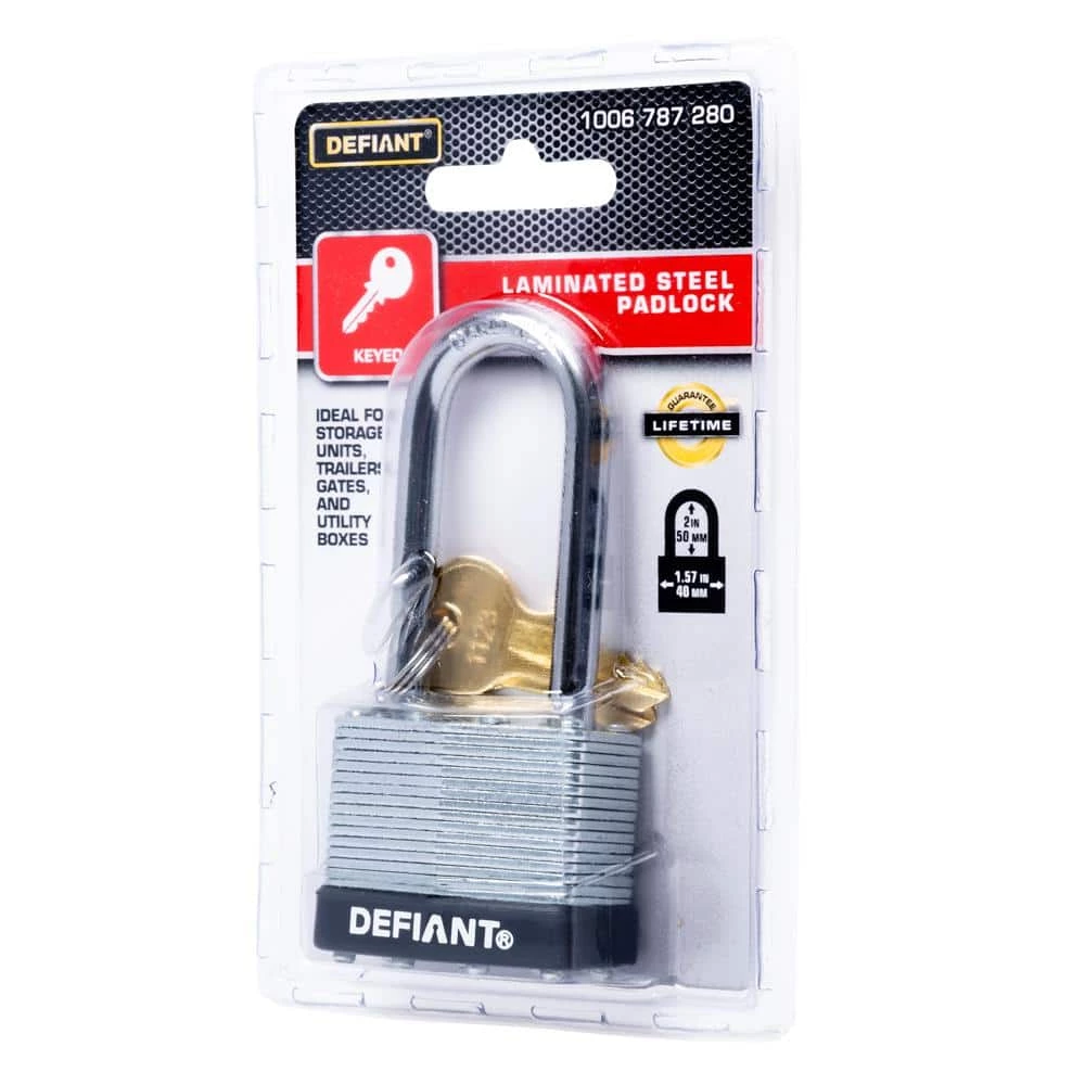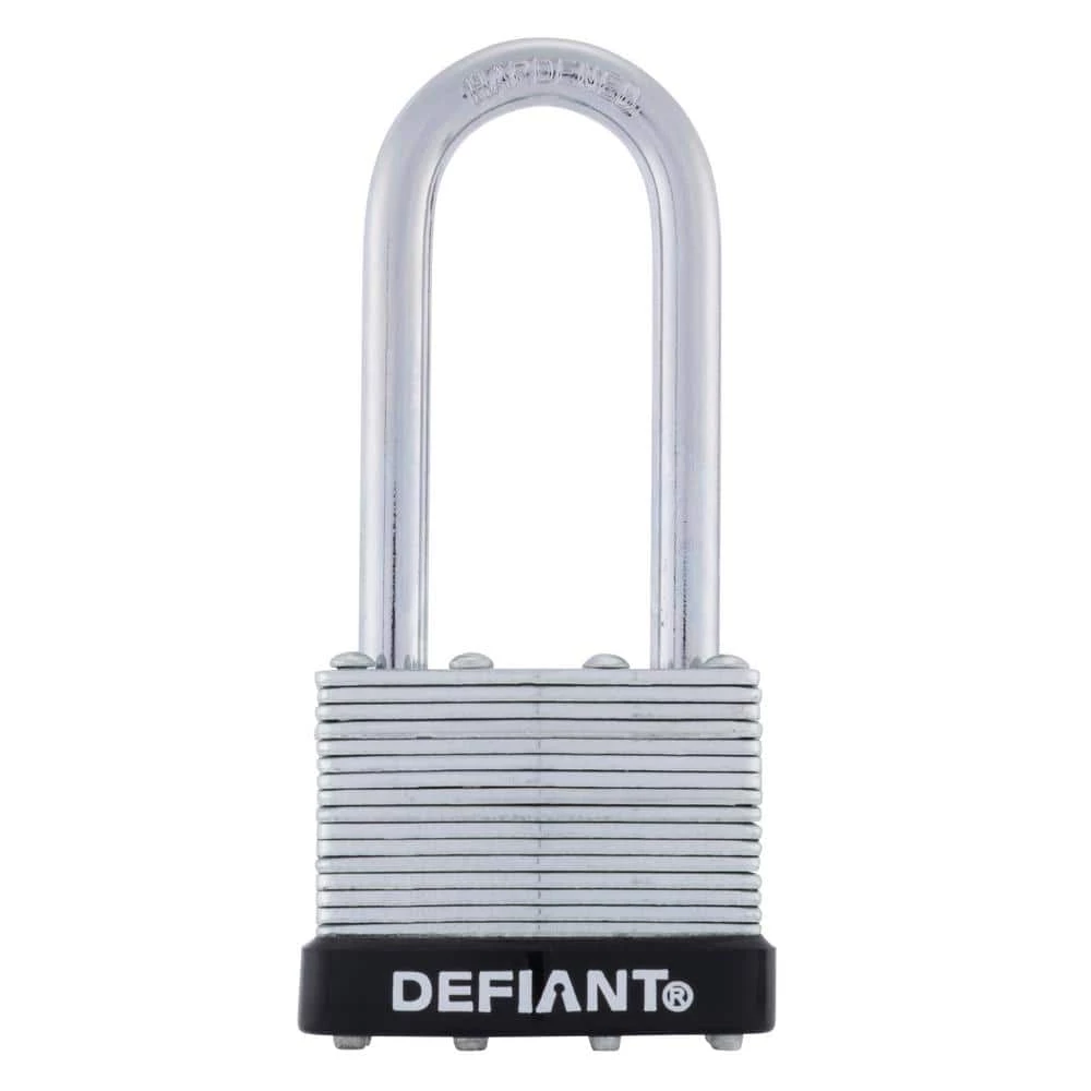 The Defiant Laminated Steel Padlock features a 40 mm body and a 2 in. chrome-plated, hardened steel shackle for increased cut resistance. It is equipped with 4 brass pin cylinders for optimal pick and pry resistance and dual lever locking mechanism for maximum security. The padlock is designed with a form-fitted plastic bumper to reduce scratching and marring. Ideal for securing storage units, chains, trailers, gates and utility boxes.