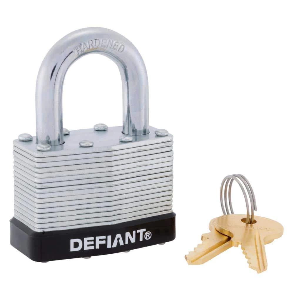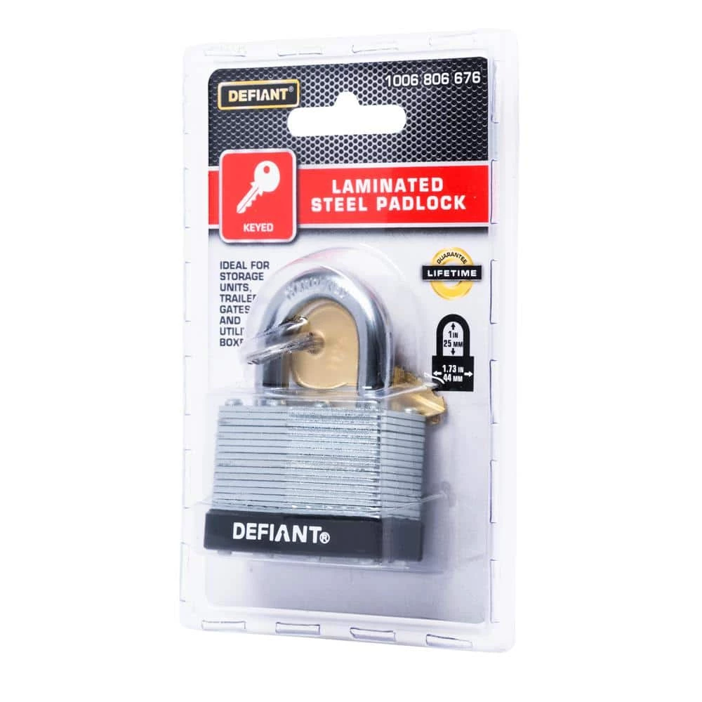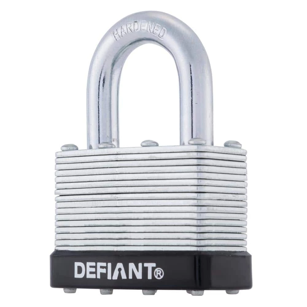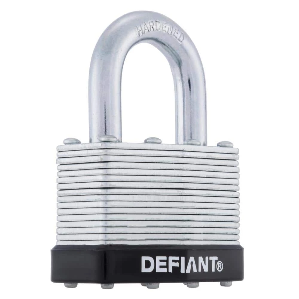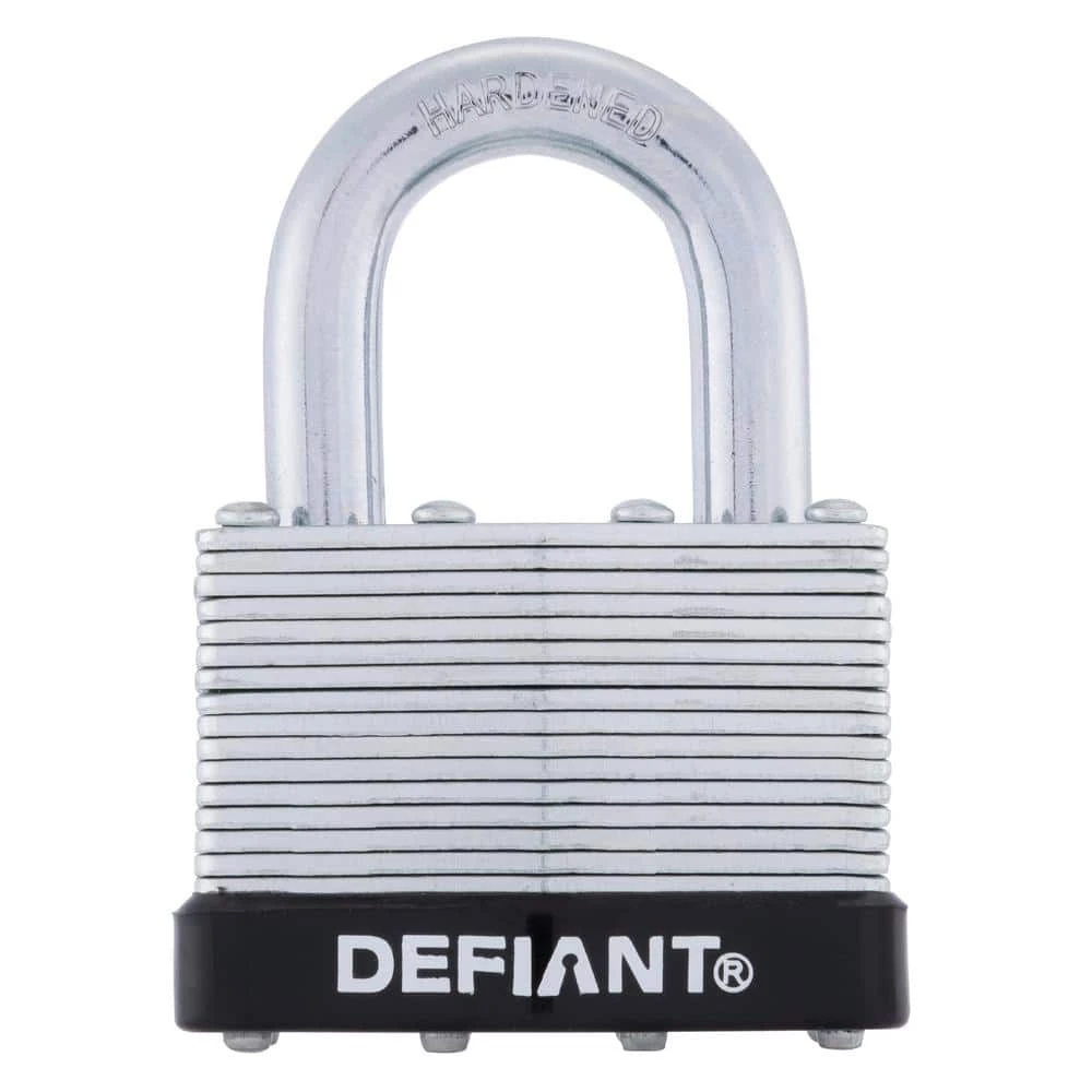 The Defiant Laminated Steel Padlock features a 44 mm body and a 1 in. chrome-plated, hardened steel shackle for increased cut resistance. It is equipped with 4 brass pin cylinders for optimal pick and pry resistance and dual lever locking mechanism for maximum security. The padlock is designed with a form-fitted plastic bumper to reduce scratching and marring. The superior corrosion resistance makes this padlock perfect for indoor and outdoor use to secure storage units, chains, trailers, gates and utility boxes.