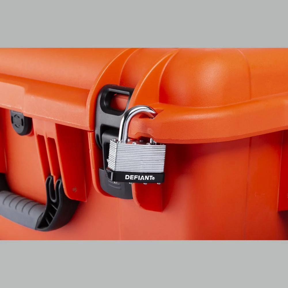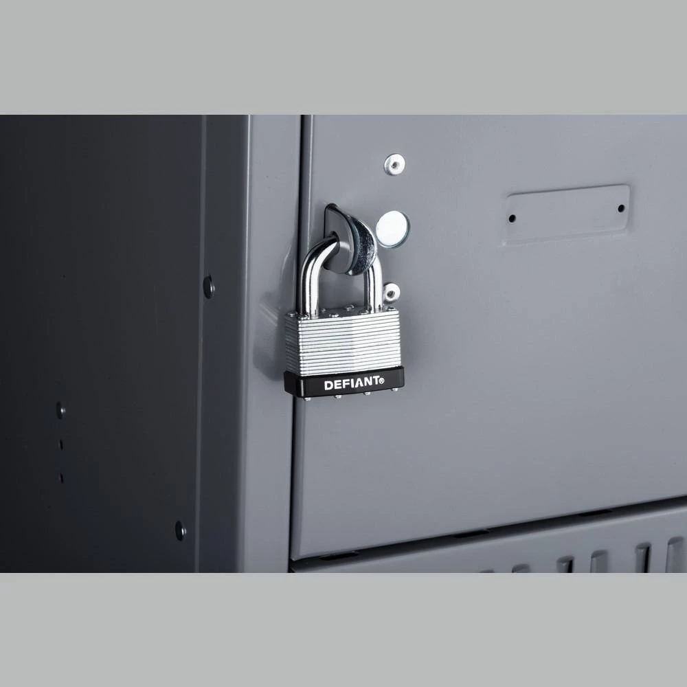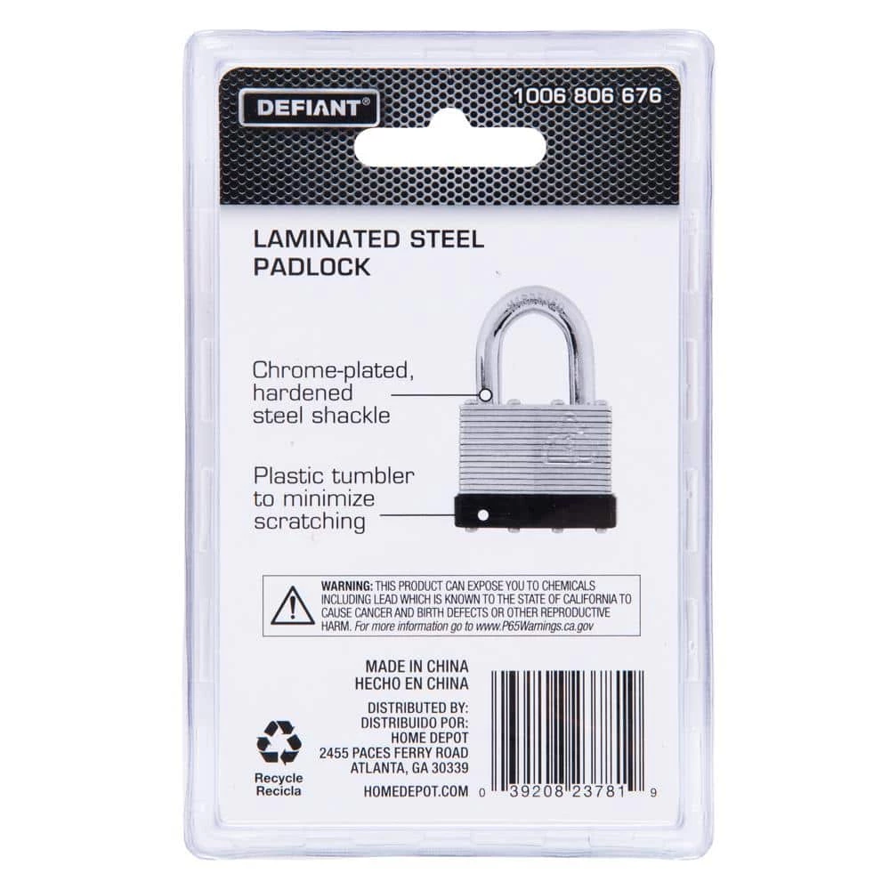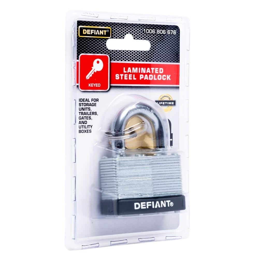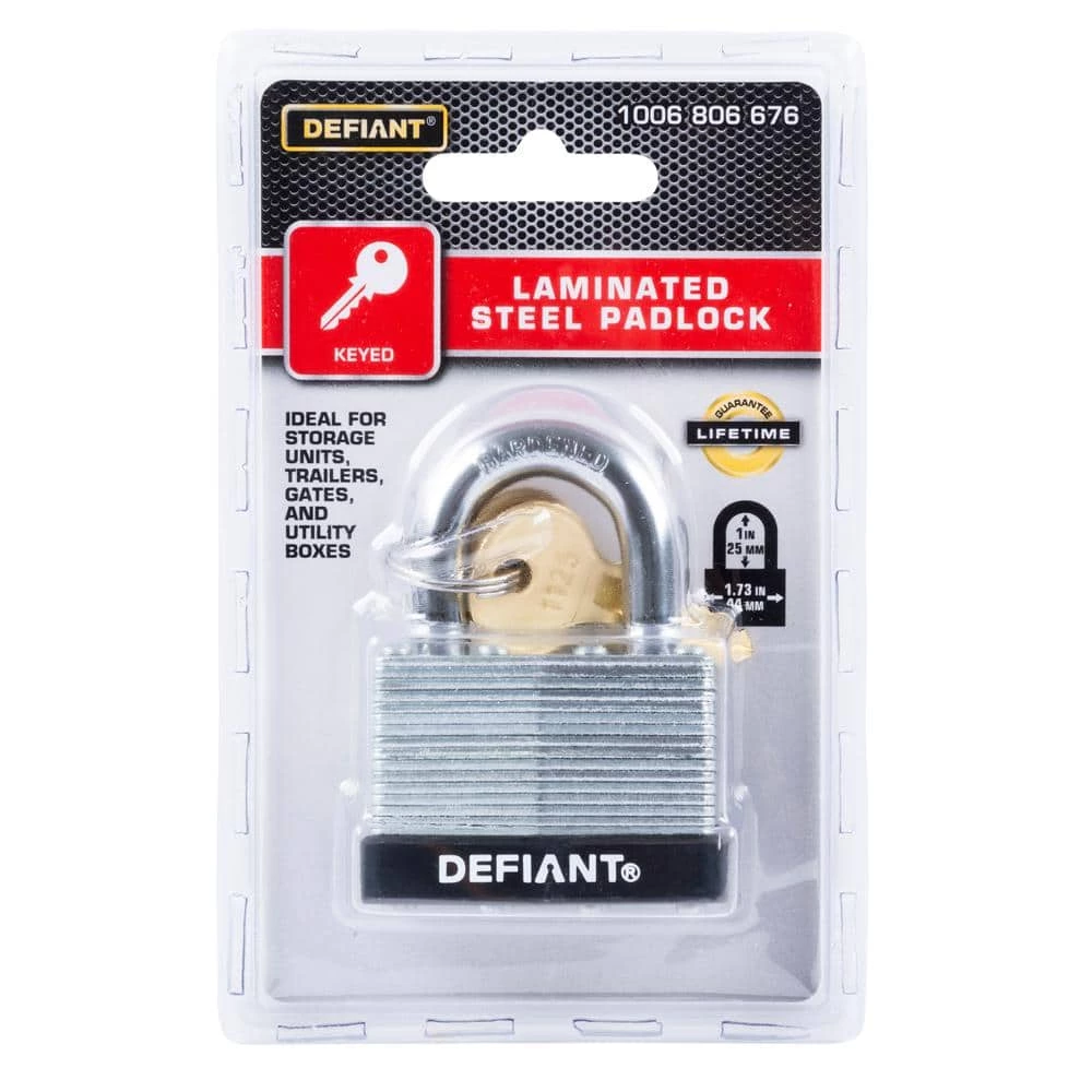 The Defiant Laminated Steel Padlock features a 44 mm body and a 1 in. chrome-plated, hardened steel shackle for increased cut resistance. It is equipped with 4 brass pin cylinders for optimal pick and pry resistance and dual lever locking mechanism for maximum security. The padlock is designed with a form-fitted plastic bumper to reduce scratching and marring. The superior corrosion resistance makes this padlock perfect for indoor and outdoor use to secure storage units, chains, trailers, gates and utility boxes.