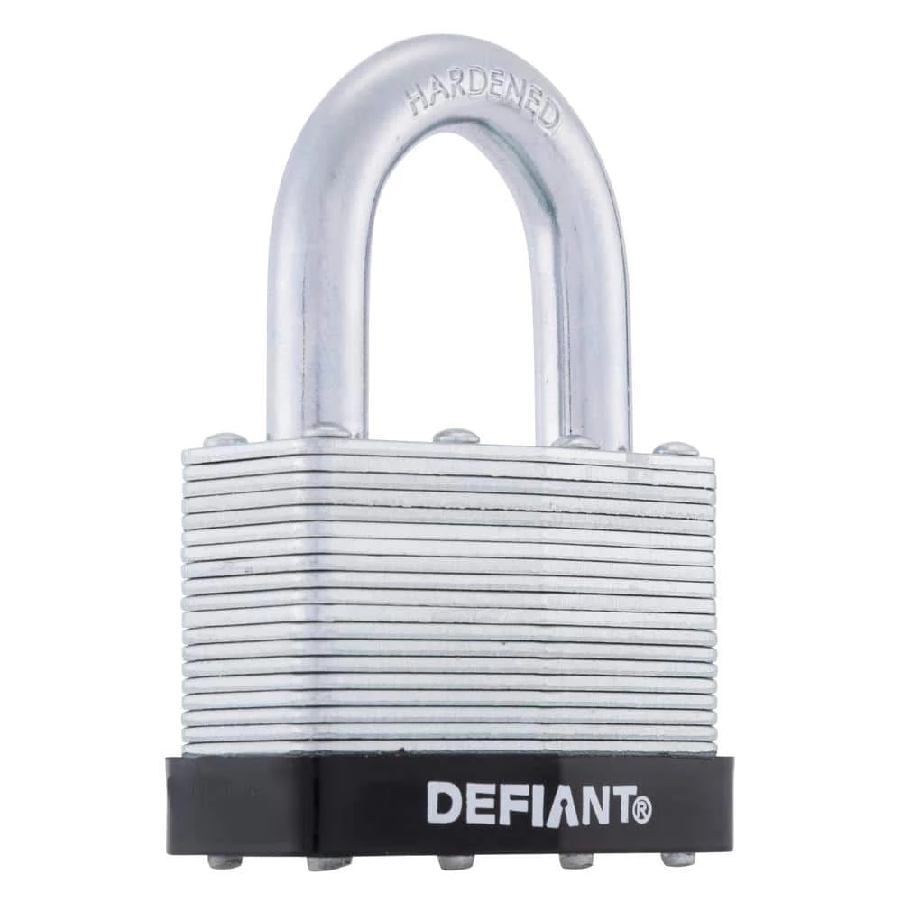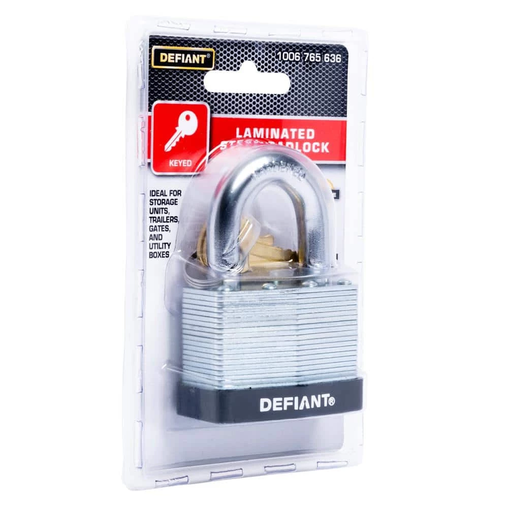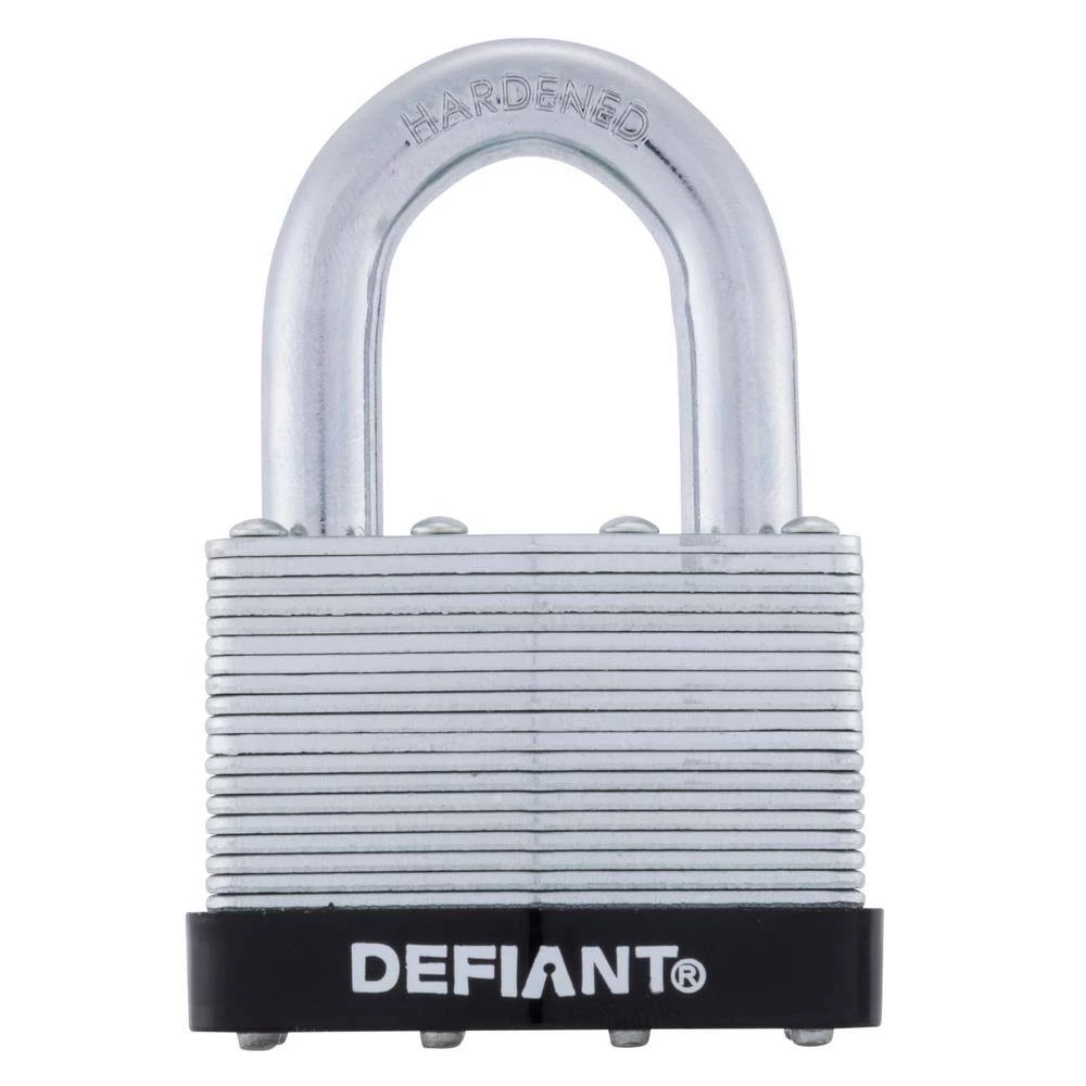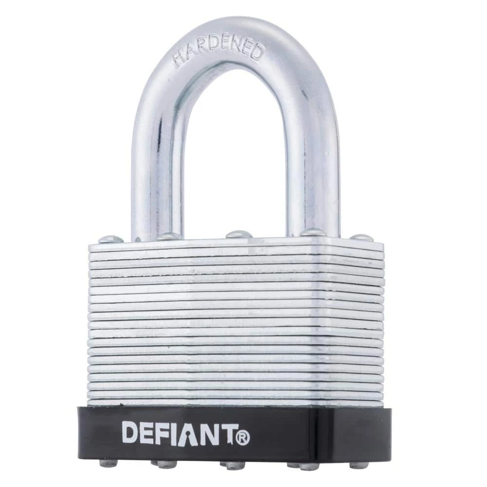 The Defiant Laminated Steel Padlock features a 50 mm body and a 1 in. chrome-plated, hardened steel shackle for increased cut resistance. It is equipped with 4 brass pin cylinders for optimal pick and pry resistance and dual lever locking mechanism for maximum security. The padlock is designed with a form-fitted plastic bumper to reduce scratching and marring. The superior corrosion resistance makes this padlock perfect for indoor and outdoor use to secure storage units, chains, trailers, gates, and utility boxes.