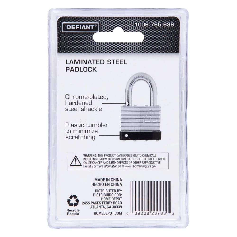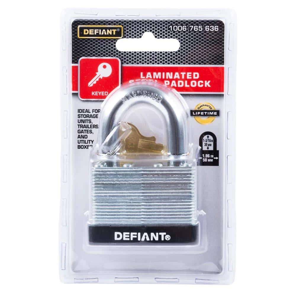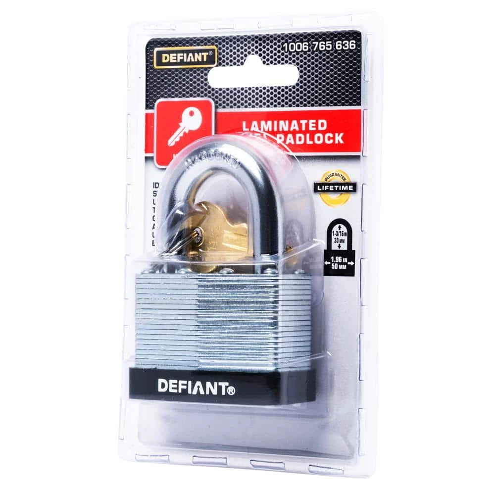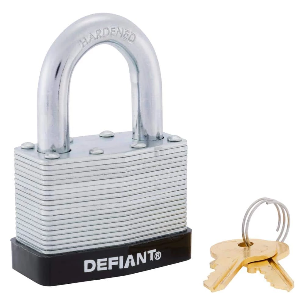 The Defiant Laminated Steel Padlock features a 50 mm body and a 1 in. chrome-plated, hardened steel shackle for increased cut resistance. It is equipped with 4 brass pin cylinders for optimal pick and pry resistance and dual lever locking mechanism for maximum security. The padlock is designed with a form-fitted plastic bumper to reduce scratching and marring. The superior corrosion resistance makes this padlock perfect for indoor and outdoor use to secure storage units, chains, trailers, gates, and utility boxes.