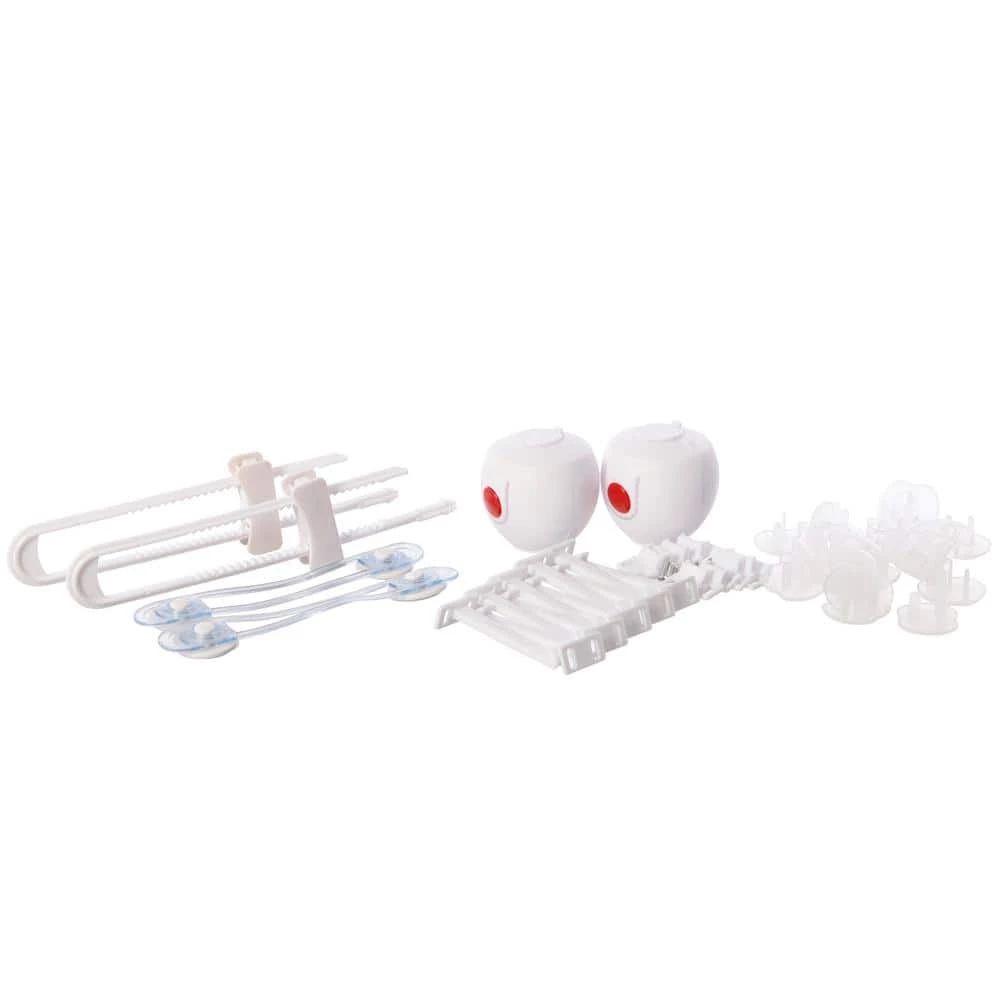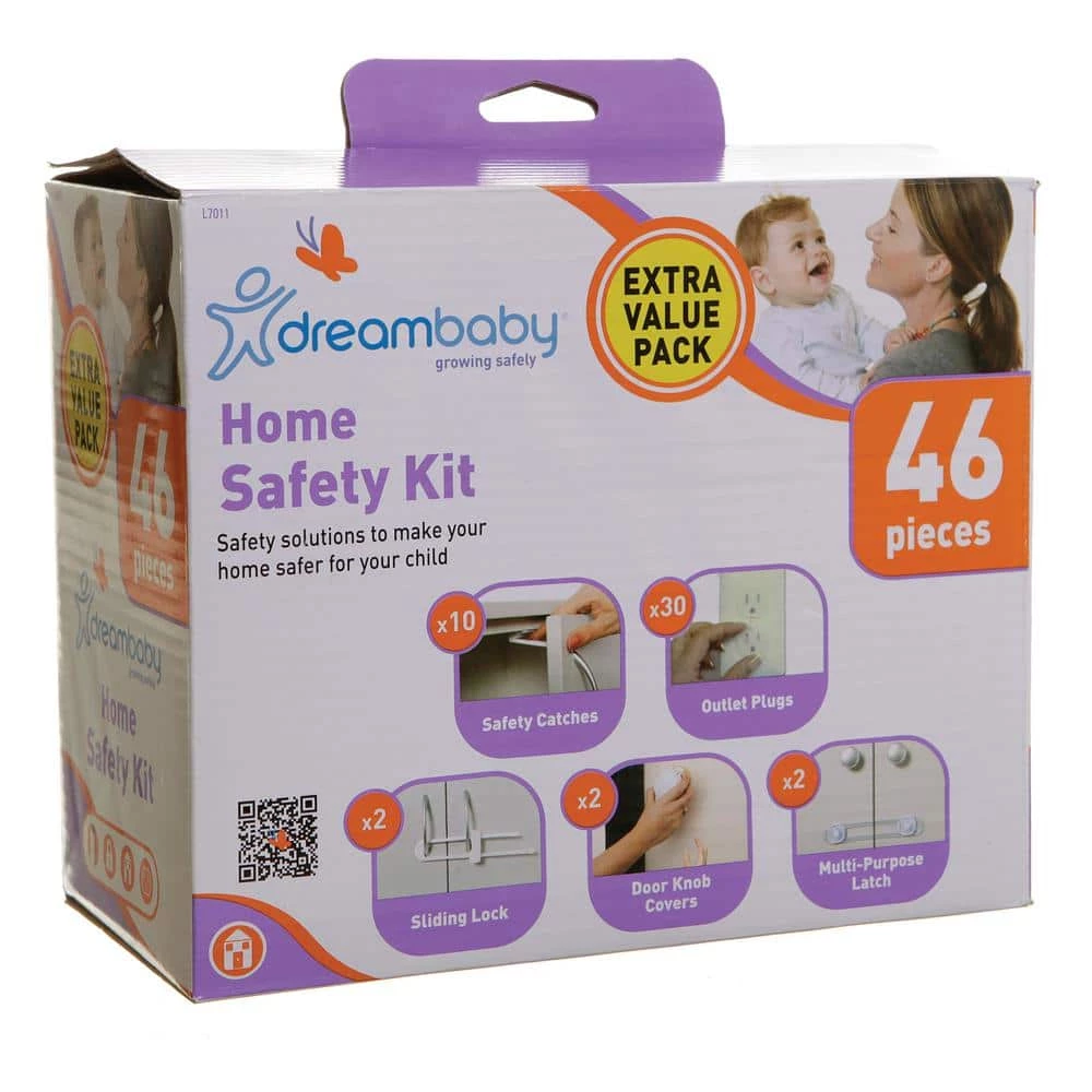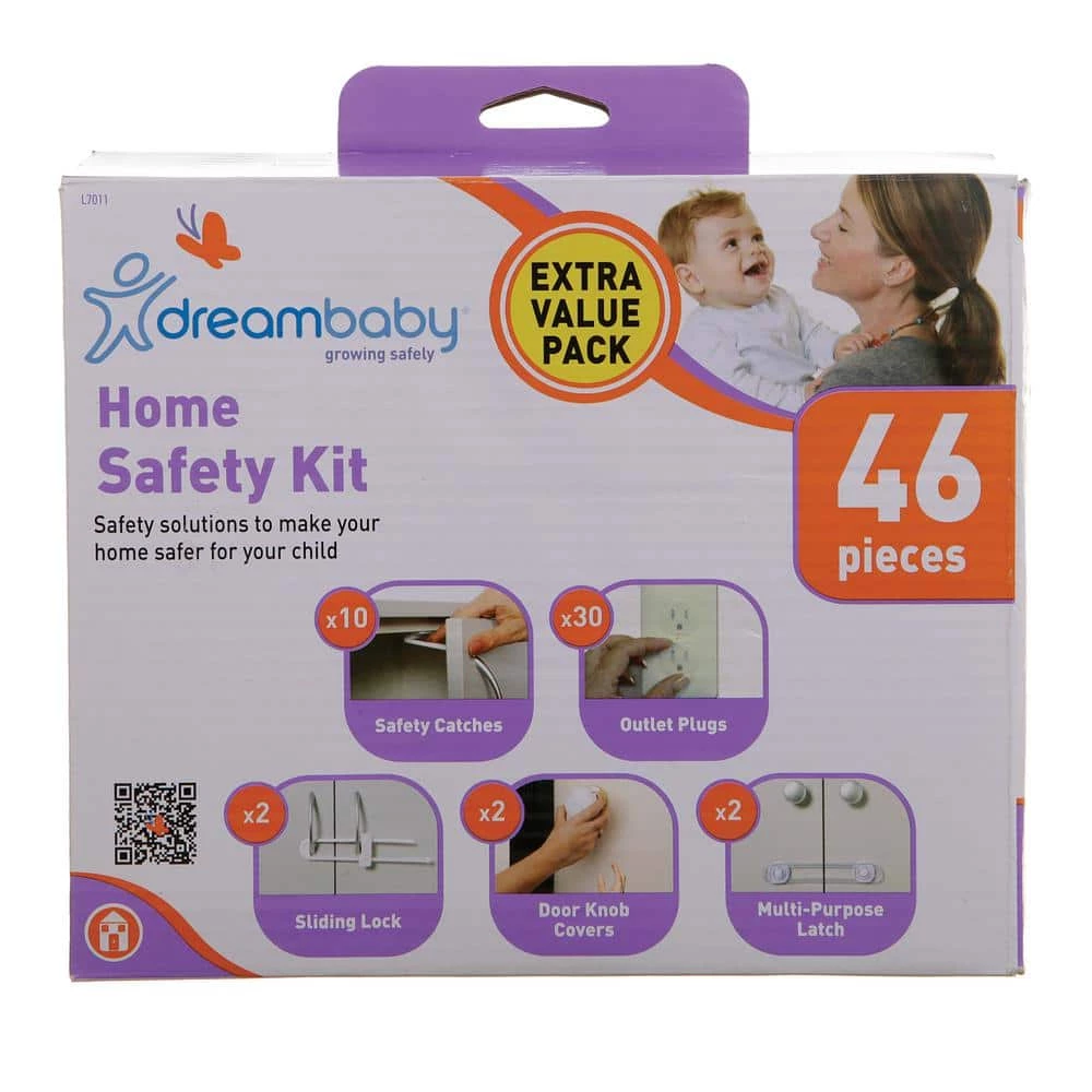 Dreambaby 46 Piece Home Safety Value Kit is a great starter kit for any home. This kit contains 10 safety catches, 30 outlet plug covers, 2 cabinet sliding locks, 2 multi-purpose latches, and 2 door knob covers. Great as a gift. 1 year warranty.