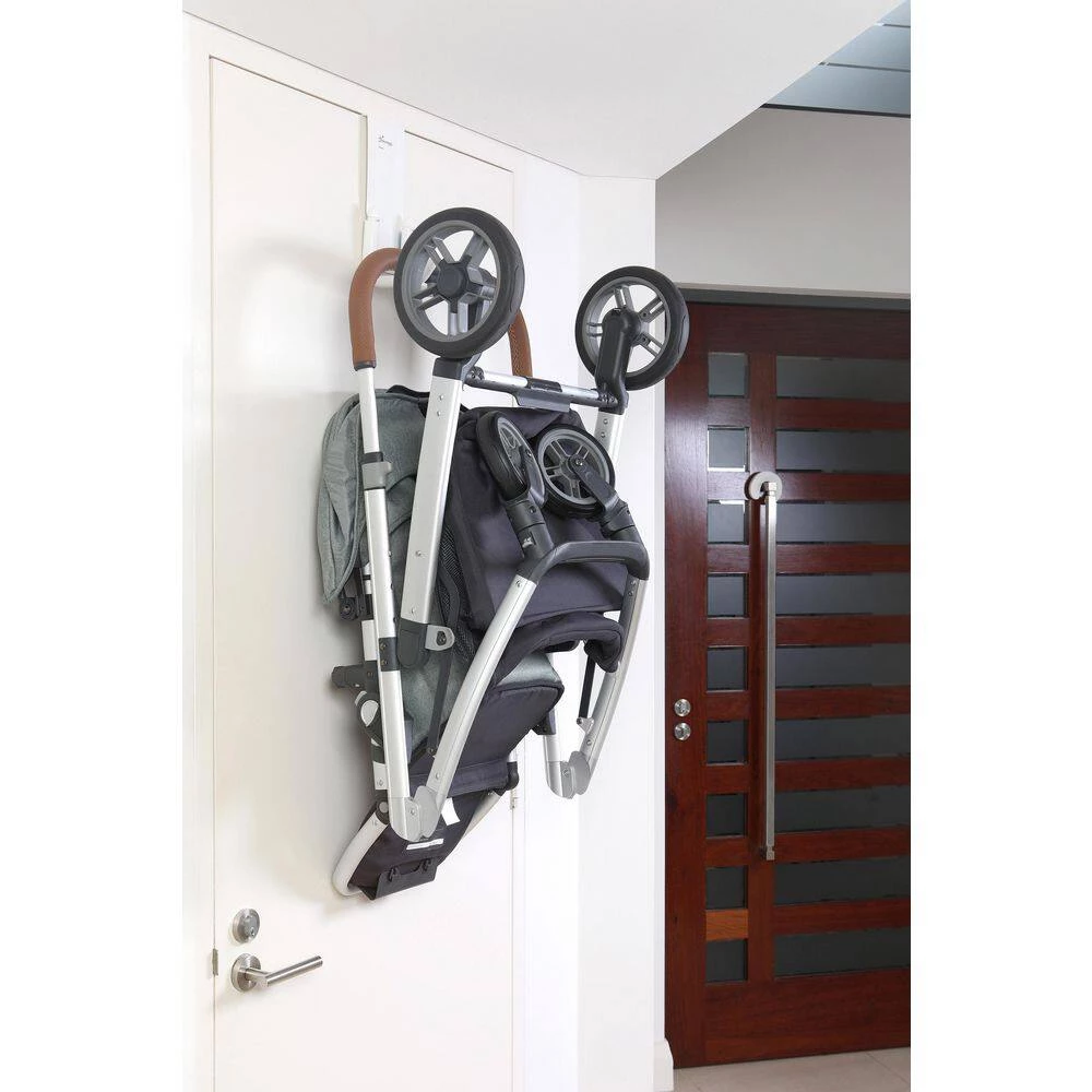 Strollers are a parent’s best friend, until you get back to the house. Then there is always the question of where to store it so it’s out of the way and not taking up room in your home or garage. That’s why Dreambaby® is offering the Patented Strollerbuddy® StrollAway® Over the Door Stroller Hanger. It’s the perfect solution to stroller storage. It takes unused space on the back of your door and turns it into a hanging spot for your stroller, allowing you to fold it up and keep it out of the way. Your home stays neat and tidy and safer with your stroller out of reach from your toddler. It’s always right there waiting for your next outing. Mounting the StrollAway® is effortless and requires no tools. Simply fit it over the top of the door and it will sit securely. You can adjust the arms to suit your stroller. The StrollAway® features defensive cushions to help keep it from rubbing or scratching the door. With no hardware, it’s a breeze to relocate which is great if you’re going on vacation or spending the weekend at grandma’s and want to store your stroller while you’re there. When the StrollAway® isn’t in use the arms rotate flat to stay almost flush with the door to prevent it from getting caught or hitting into other things. It’s perfect for every family with a stroller. Holding up to 50 pounds and with adjustable, long arms, it’s designed to hold virtually any stroller.