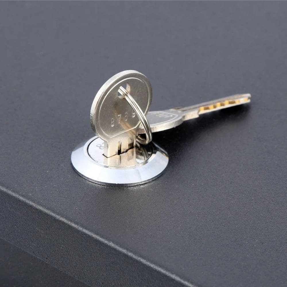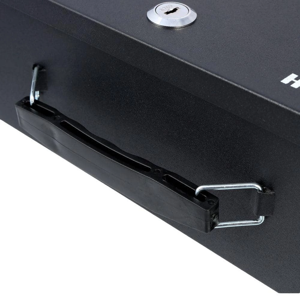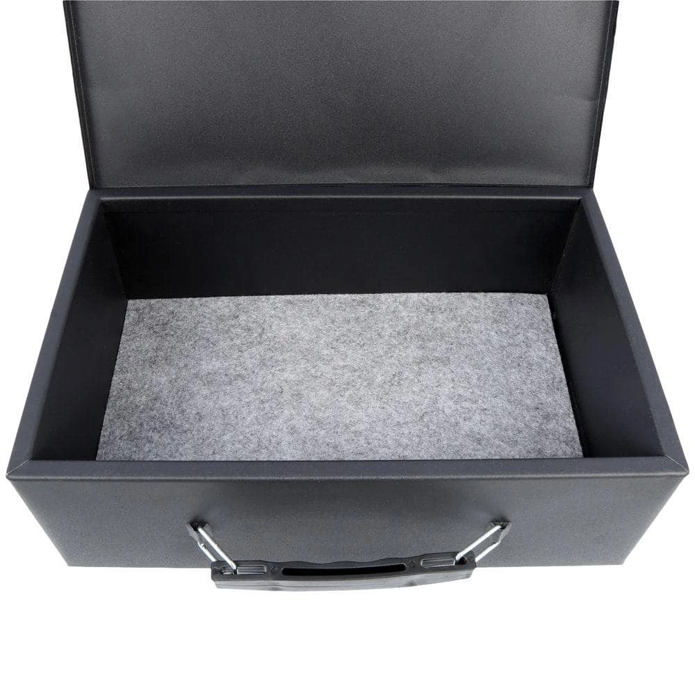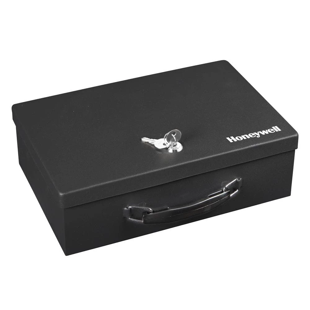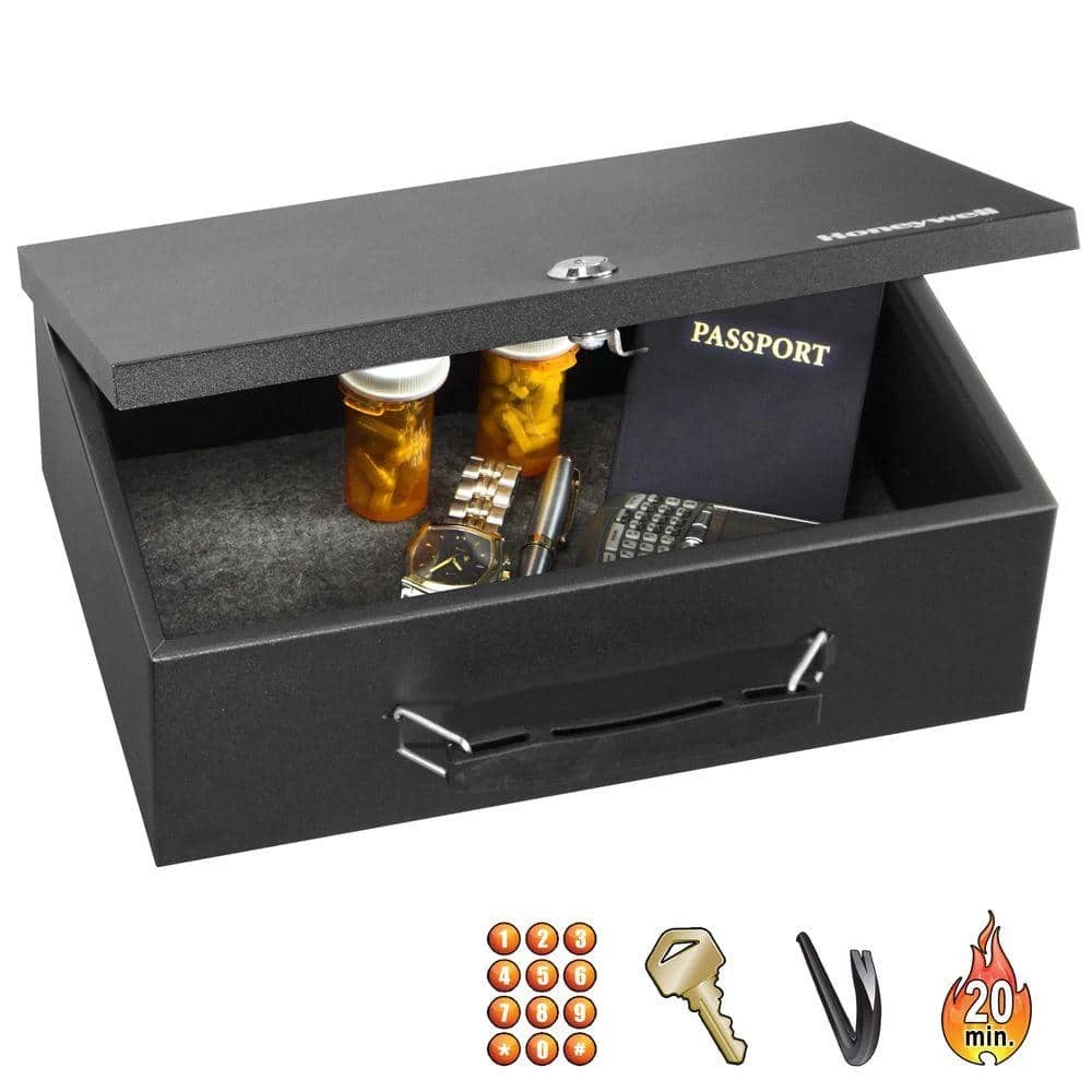 The Honeywell Model 6104 Fire Resistant Steel Security Box features a double steel wall construction with a fire resistant insulation. This safe also features 0.17 cu. ft. storage capacity, a concealed hinge, foam padded floor, scratch resistant powder coat finish and a convenient carry handle. This security box is small, lightweight and big enough to store small documents, personal items, passports or a cell phone. Includes 2 entry keys. Backed by a 1-year limited warranty.