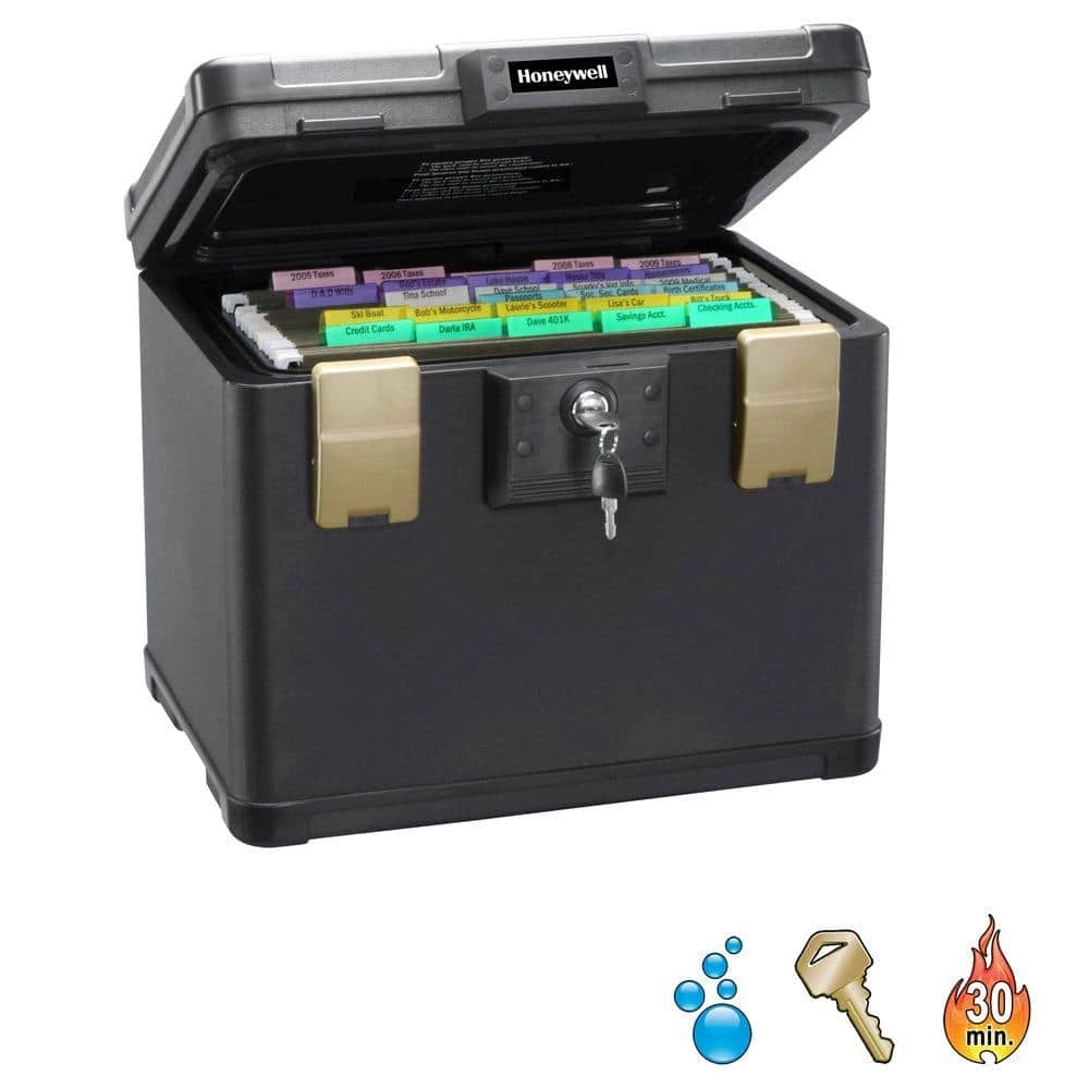 When disaster strikes, protecting your most important documents and irreplaceable data will ease and expedite your recovery process. This fireproof chest is excellent for the safe storage of letter and A4 size hanging file folders along with many types of digital media. The Honeywell 1106 0.60 cu. ft. Molded Fire and Waterproof File Chest has a 30-Minute UL Fire protection rating up to 1550 degree F/843 degree C. A waterproof seal and special latch design protects contents against water damage caused by Mother Nature and/or accidents for 24 hours, even when completely submerged under 1 m. Perfect size to fit into any area in your home or office. Honeywell safes are backed by an industry leading 7-year limited warranty. In the event of a fire the contents will be protected but the chest itself will likely be damaged. Our Lifetime After-Fire Free Replacement guarantee means that we will provide you with a new replacement chest if it is damaged in a fire.
