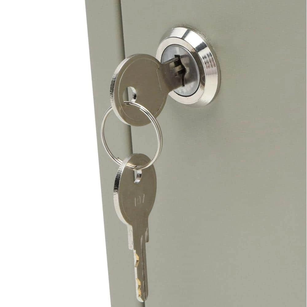 Kidde KeySafe Pro Key-Lock Key Safe holds up to 120 keys and comes with a keyed cam-lock and 2 keys. This durable, heavy-duty locker is made of 16-gauge steel and features a continuous piano hinge for a strong and secure door. It includes numbered key tags with key rings and a lock location chart for easy reference. This clay-colored safe comes with 4-point mounting hardware and pre-drilled holes for convenient installation.