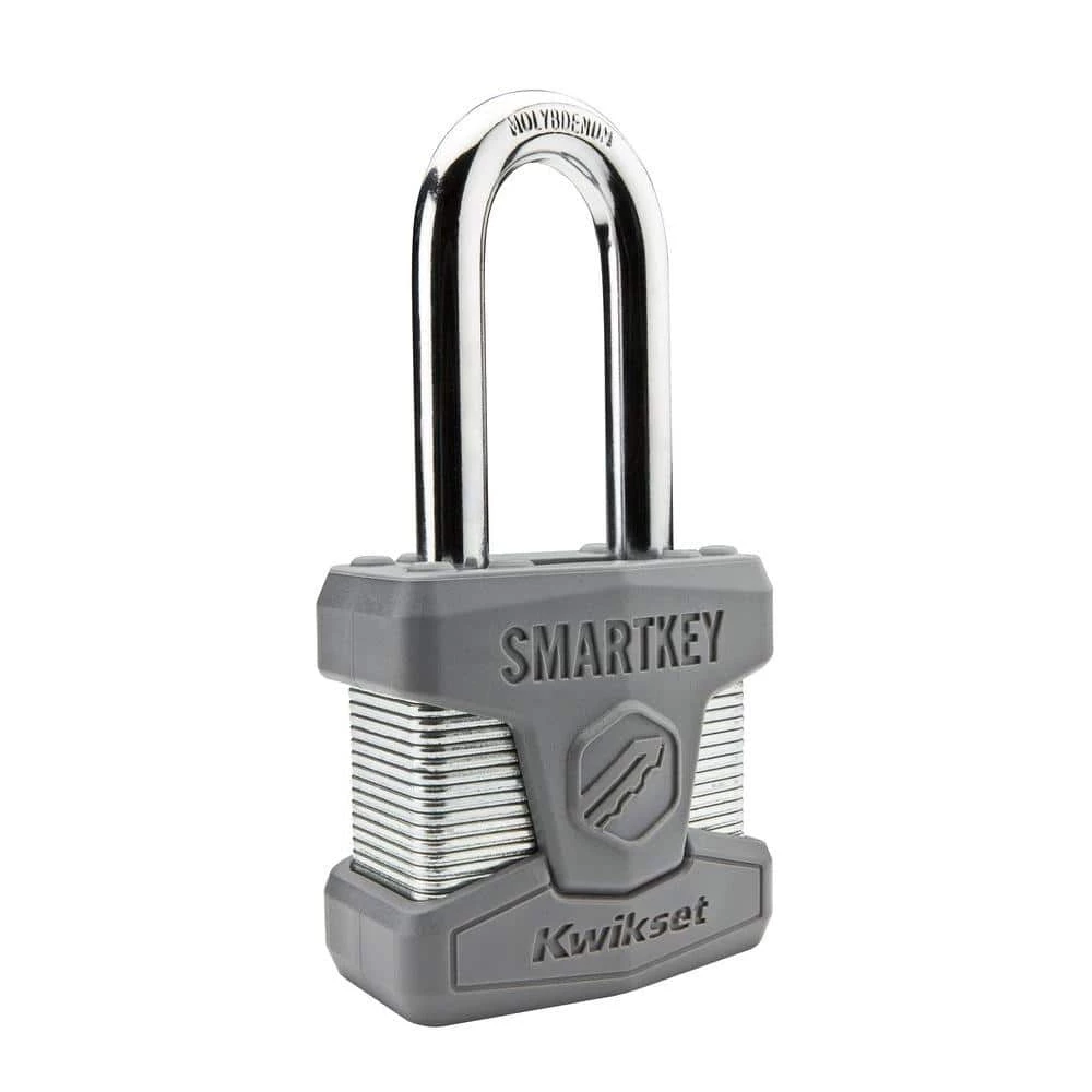 Introducing the SmartKey Security Padlock form Kwikset. Quickly and easily re-key your new padlock to work with the key from any SmartKey Security Lock. The hardened molybdenum shackle provides superior resistance to sawing and cutting.