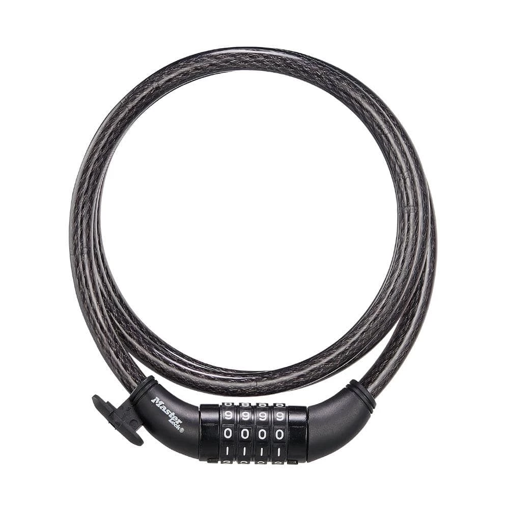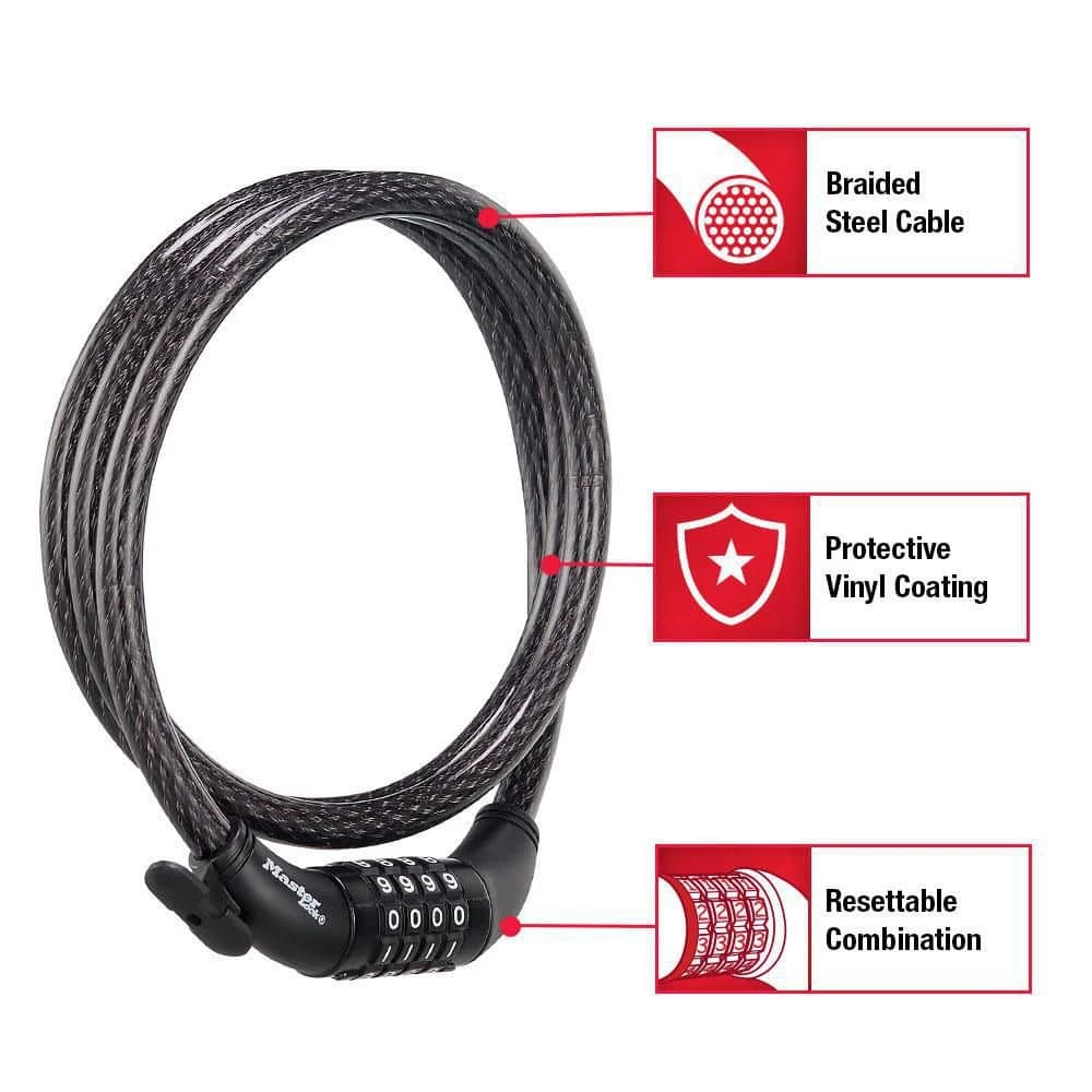 The Master Lock 8370DCC Bike Lock Cable with Combination, Resettable is 5 ft. (1.5 m.) long and features 1/2 in. (12 mm.) diameter braided steel for maximum strength and flexibility. Bike lock cable offers a protective vinyl coating which protects against scratches. Bike lock includes a four-dial combination lock which provides security and key-less convenience. Master Lock’s Lifetime Guarantee provides peace of mind from a brand you can trust.