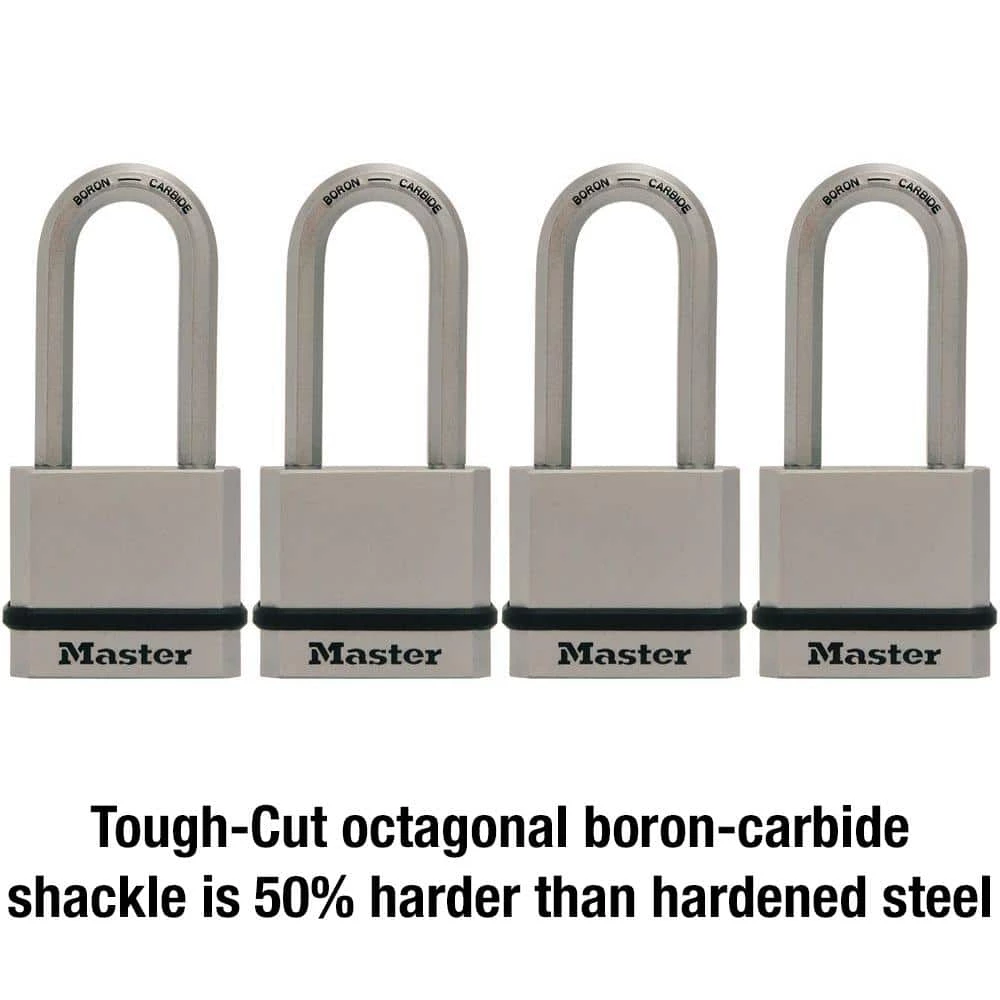 - Four-pin cylinder and dual ball bearing locking mechanism provides maximum pick and pry resistance; Tough-Cut octagonal boron-carbide shackle is 50% harder than hardened steel