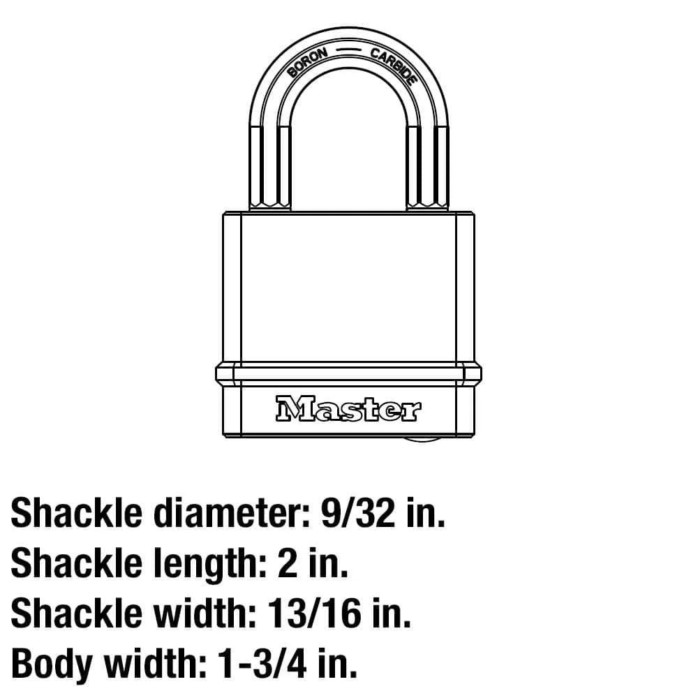 - Measurements: 1-3/4 in. (44 mm.) wide lock body; 9/32 in. (7 mm.) diameter shackle with 2 in. (51 mm.) length, 13/16 in. (21 mm.) width; Extended shackle for application flexibility