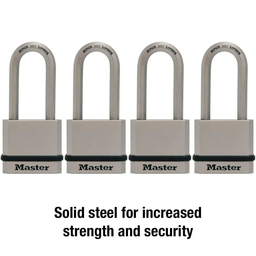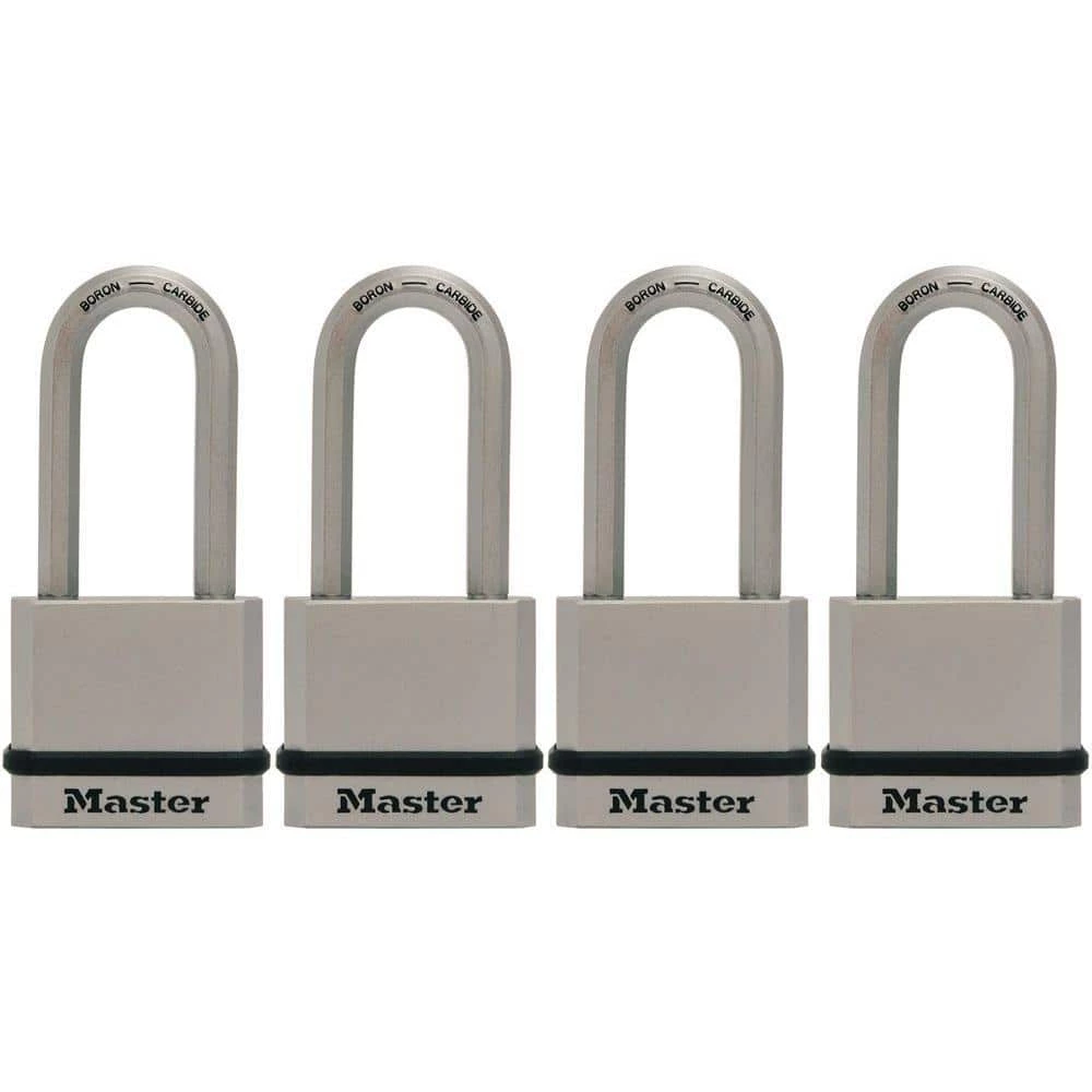 The Master Lock M530XQLH Heavy Duty Outdoor Padlock with Key, Four Pack, features a 1-3/4 in. (44 mm.) wide solid steel body for maximum strength and reliability. Octagonal lock shackle is 2 in. (51 mm.) long and made of tough-cut boron-carbide, 50% harder than hardened steel, offering maximum resistance from cutting and sawing. Lock five-pin cylinder prevents picking and the dual locking ball bearings provide maximum resistance against prying and hammering. Padlock covered keyway offers maximum weather protection, and reinforced body bumper protects against scratches. Master Lock’s Lifetime Guarantee provides peace of mind from a brand you can trust.
