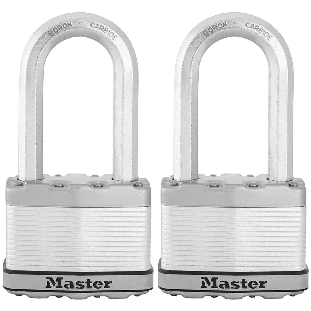 The Master Lock M15XTLJ Heavy Duty Outdoor Padlock with Key, Two Pack features a 2-1/2 in. (64 mm.) wide laminated steel body for maximum strength and reliability, and it is surrounded by stainless steel and zinc outer components for weather resistance. Octagonal lock shackle is 7/16 in. (11 mm.) wide in diameter and is 2-1/2 in. (64 mm.) long and made of Tough-Cut boron-carbide, 50% harder than hardened steel, offering maximum resistance from cutting and sawing. The five-pin cylinder prevents picking and the dual locking ball bearings provide maximum resistance against prying and hammering. Master Lock’s Lifetime Guarantee provides peace of mind from a brand you can trust.
