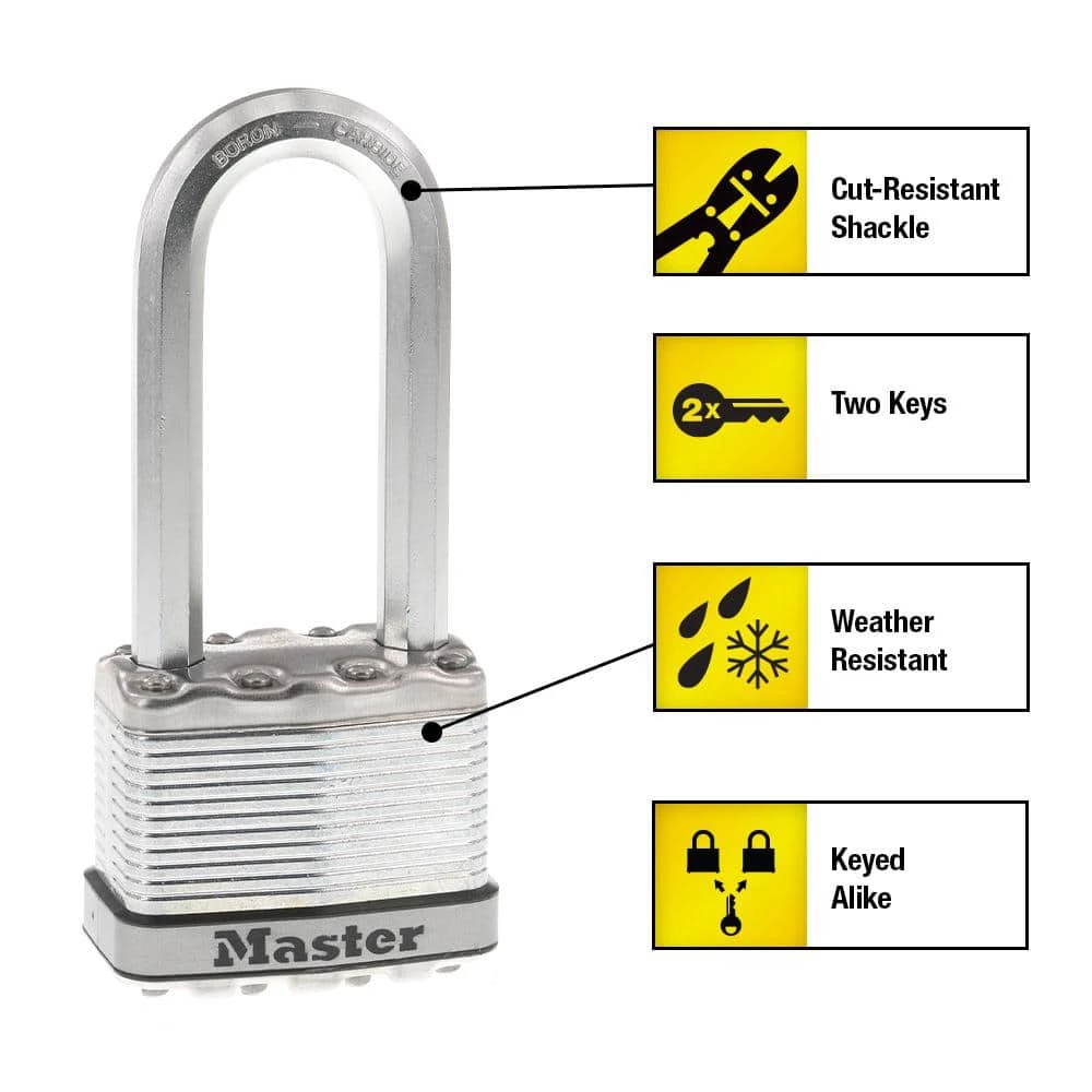The Master Lock M5XTLJCCSEN Heavy Duty Outdoor Padlock with Key, Two Pack features a 2 in. (51 mm.) wide laminated steel body for maximum strength and reliability, and is surrounded by stainless steel and zinc outer components for weather resistance. Octagonal lock shackle is 3/8 in. (10 mm.) wide in diameter and is 2-1/2 in. (64 mm.) long and made of Tough-Cut boron-carbide, 50% harder than hardened steel, offering maximum resistance from cutting and sawing. Lock four-pin cylinder prevents picking and the dual locking ball bearings provide maximum resistance against prying and hammering. Master Lock’s Lifetime Guarantee provides peace of mind from a brand you can trust.