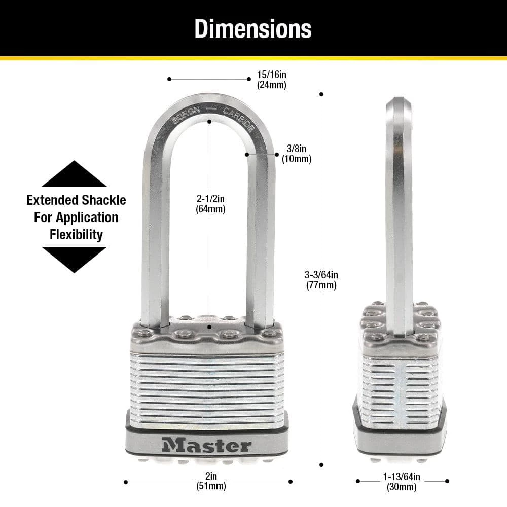 - Measurements: 2 in. (51 mm.) wide lock body; 3/8 in. (10 mm.) diameter shackle with 2-1/2 in. (64 mm.) length, 15/16 in. (24 mm.) width; Extended shackle for application flexibility
