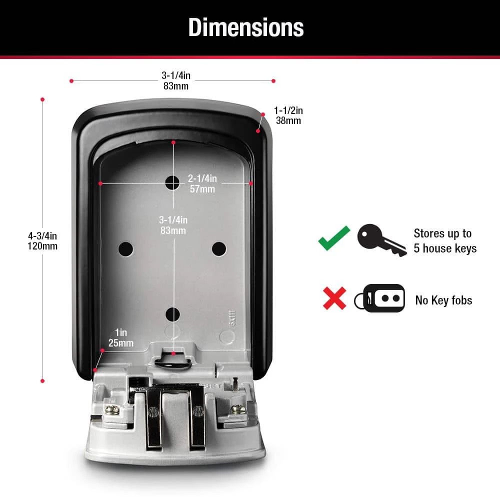 - Lock Box Measurements: Exterior dimensions: 4-3/4 in. (12 cm.) height, 3-1/4 in. (8.3 cm.) width, 1-1/2 in. (3.8 cm.) depth; Interior dimensions: 3-1/4 in. (8.3 cm.) height, 2-1/4 in. (5.7 cm.) width, 1 in. (2.5 cm.) depth