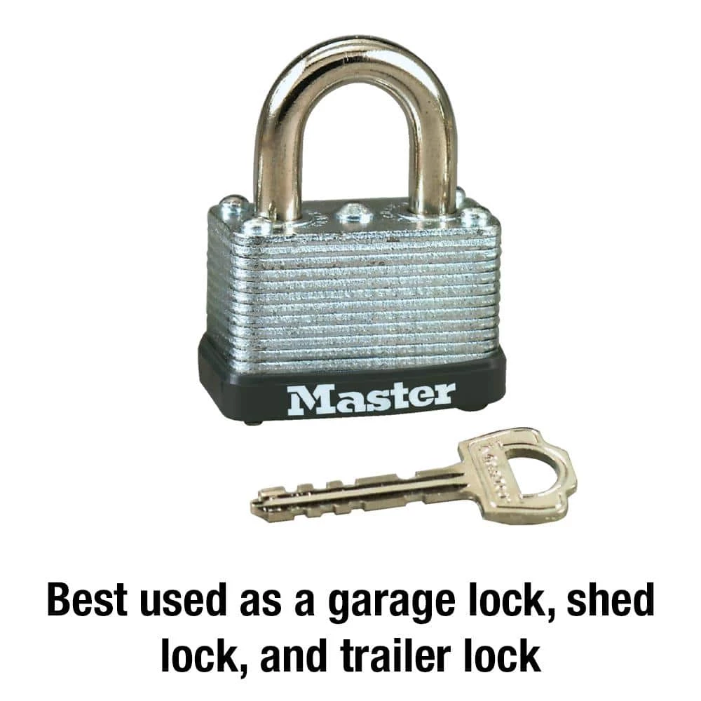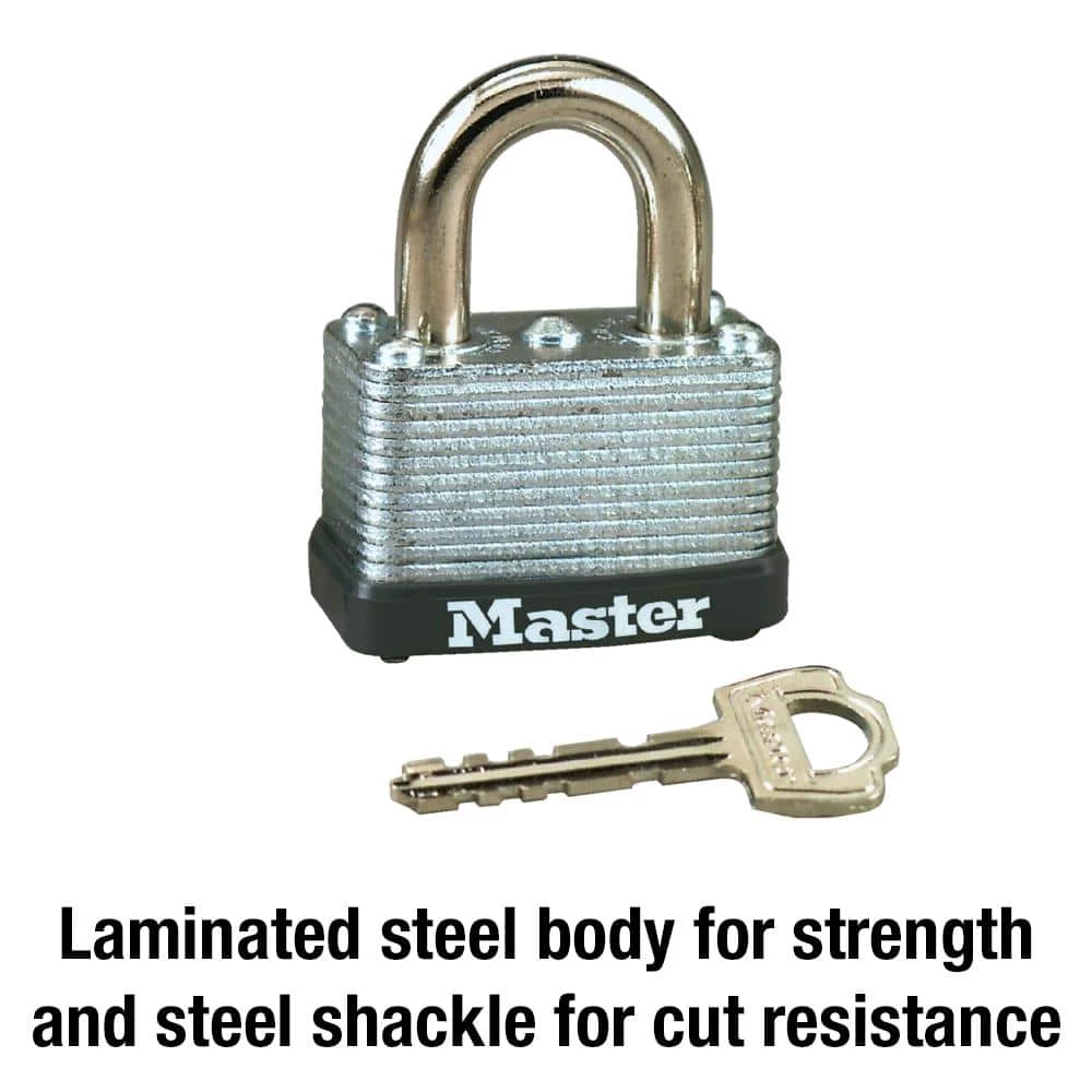 The Master Lock 8596D Lock with Key features a 1-1/2 in. (38 mm.) wide laminated steel body for strength and reliability. Lock shackle is 1/4 in. (6 mm.) in diameter and is 5/8 in. (16 mm.) long and made of steel, offering strong resistance from cutting. Padlock is warded with a single locking lever mechanism that minimizes jamming from dirt and grime. Master Lock’s Lifetime Guarantee provides peace of mind from a brand you can trust.