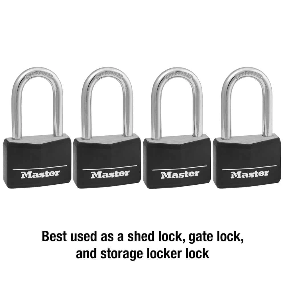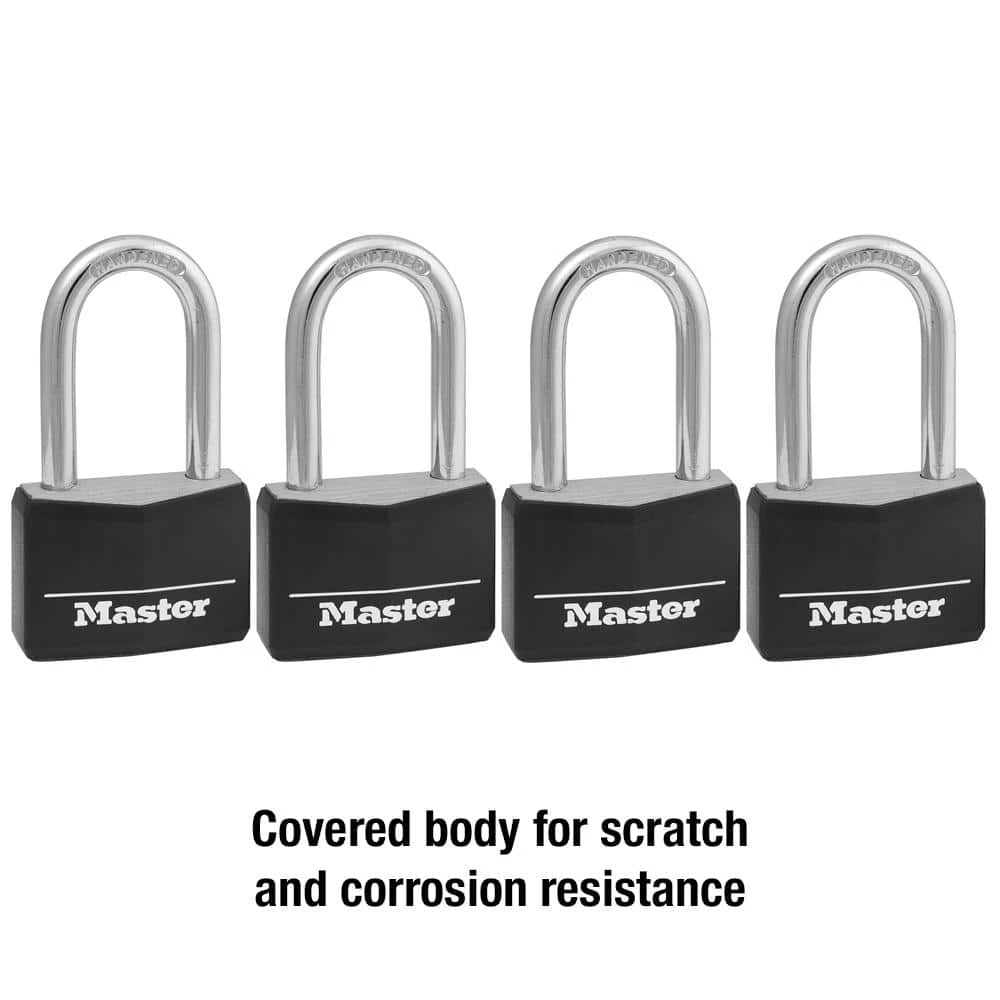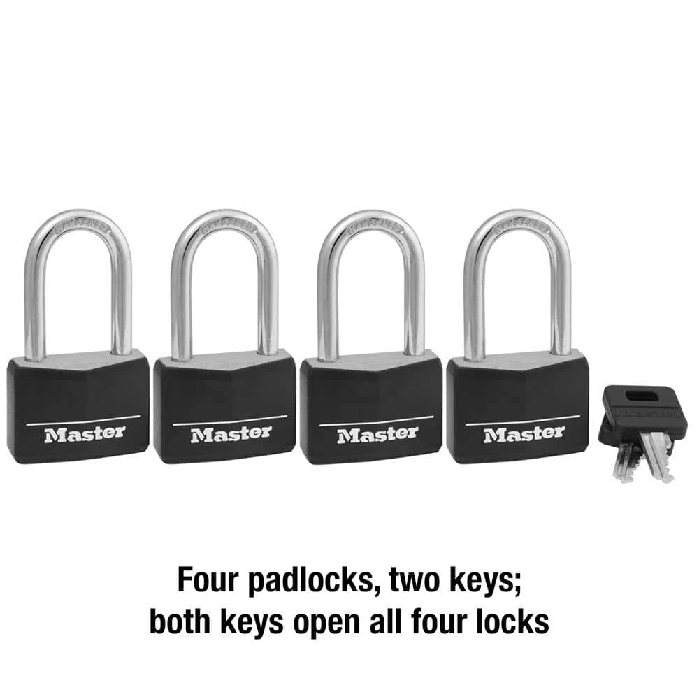 The Master Lock 141QLF Lock with Key, Four Pack features a 1-9/16 in. (40 mm) wide black vinyl covered body for scratch and corrosion resistance. Keyed Lock shackle is 1/4 in. (6 mm.) in diameter and is 1-1/2 in. (38 mm.) long and made of hardened steel, offering extra resistance from cutting and sawing. Lock features a four-pin cylinder that prevents picking and the dual locking levers provide resistance against prying and hammering. Master Lock’s Lifetime Guarantee provides peace of mind from a brand you can trust.