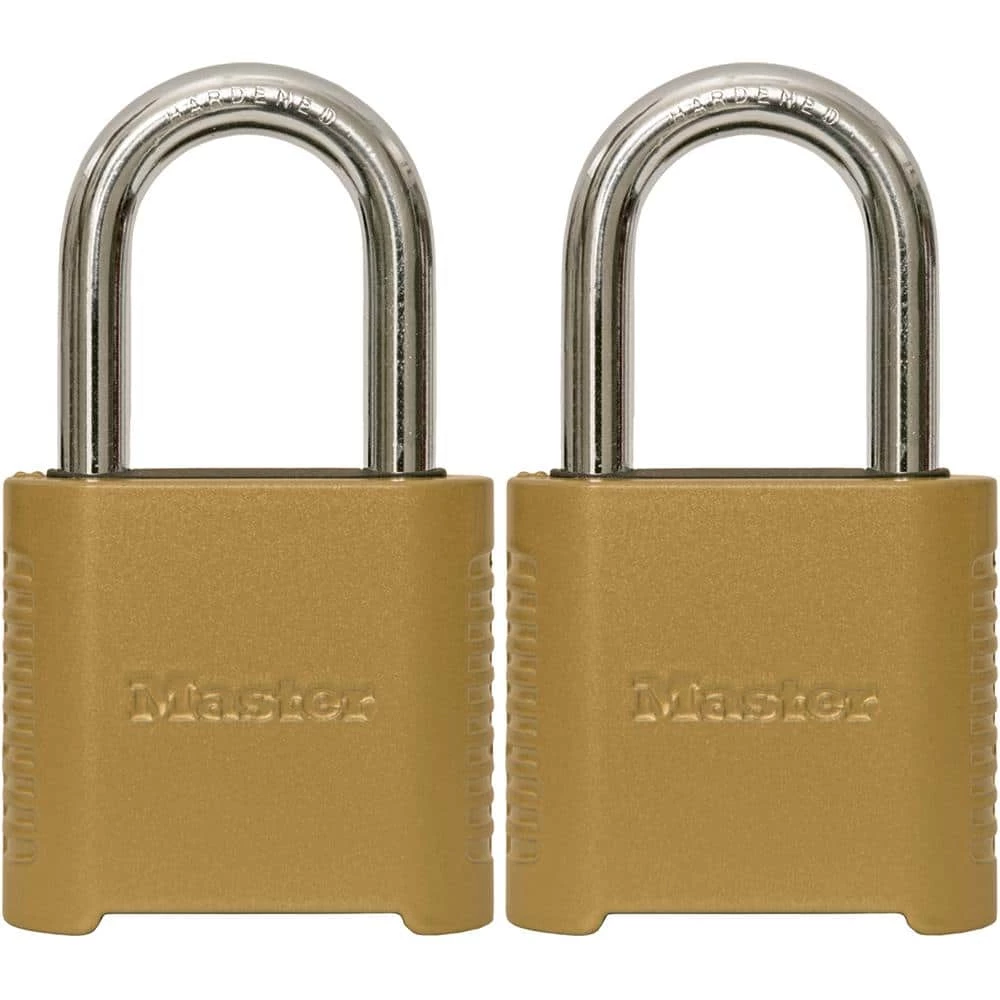 The Master Lock 875TLF Outdoor Combination Lock with Resettable Combination (Two Pack) features a 2 in. (51 mm.) wide zinc body for strength and reliability. Combination lock has a 5/16 in. (8 mm.) diameter shackle that is 1-1/2 in. (38 mm.) long and made of hardened steel, offering extra resistance from cutting and sawing. Lock roller pin mechanism provides maximum protection against attacks. Padlock shackle seal offers superior weather protection. Combination lock includes set your own combination convenience, without the need for a reset tool. Combination padlock offers four-digit dialing allows for thousands of possible numeric combinations. Master Lock’s Lifetime Guarantee provides peace of mind from a brand you can trust.