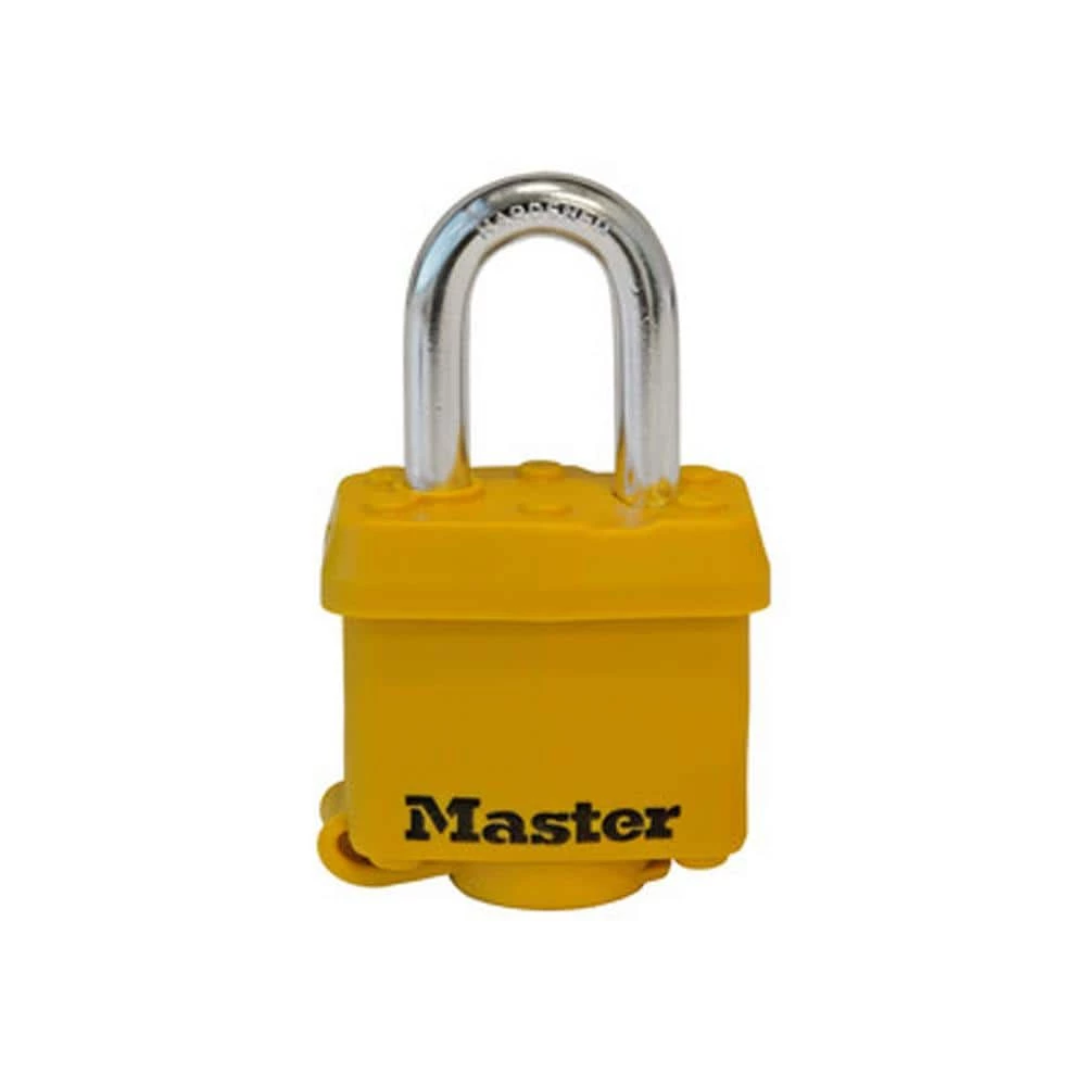 The Master Lock 315KADHC Outdoor Padlock with Key features a 1-9/16 in. (40 mm.) wide laminated steel body for superior strength and a 3/4 in. (19 mm.) long, 3/8 in. (10 mm.) diameter hardened steel shackle with molded cover for excellent cut strength and weather resistance. A yellow, weather resistant thermoplastic cover protects the keyed lock against environmental elements such as moisture, dirt & grime. Lock with key features a four-pin cylinder which prevents picking and the dual locking ball bearings provide resistance against prying and hammering. Master Lock’s Lifetime Guarantee provides peace of mind from a brand you can trust.