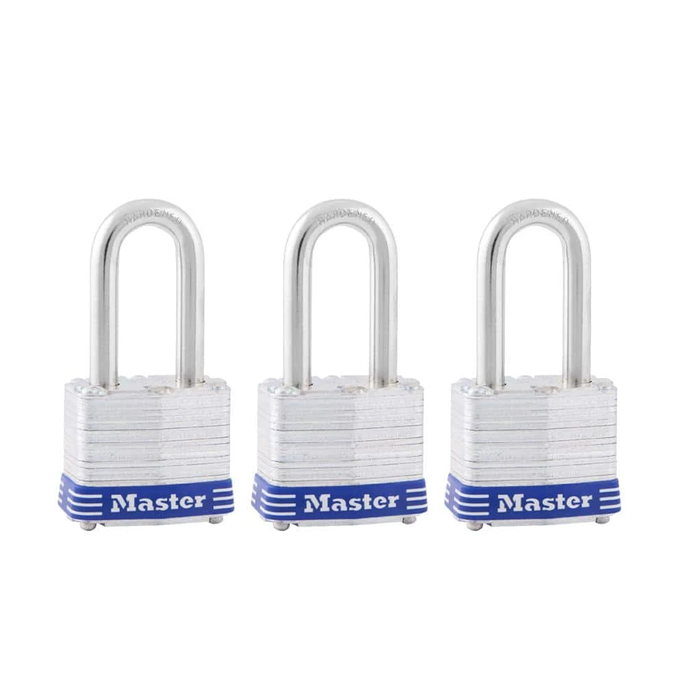 The Master Lock 3TRILFHC Outdoor Padlock with Key, Three Pack features a 1-9/16 in. (40 mm.) wide laminated steel body for maximum strength and reliability. Lock shackle is 9/32 in. (7 mm.) wide in diameter and 1-1/2 in. (38 mm.) long and made of hardened steel, offering extra resistance from cutting and sawing. Lock four-pin cylinder prevents picking and the dual locking ball bearings provide resistance against prying and hammering. Master Lock’s Lifetime Guarantee provides peace of mind from a brand you can trust.