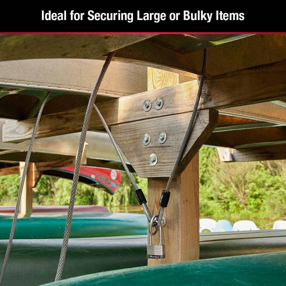 The Master Lock 72D Steel Cable with Looped Ends is 15 ft. (4.6 m.) long and features 3/8 in. (10 mm.) diameter braided steel for maximum strength and flexibility. Steel cable includes a protective vinyl coating protects against scratches. Looped end cable is self-coiling for easy storage. Steel cable is recommended to be used with laminated locks, solid steel locks and mini-U-locks, to secure large or bulky items (locks are sold separately). Master Lock’s Lifetime Guarantee provides peace of mind from a brand you can trust.