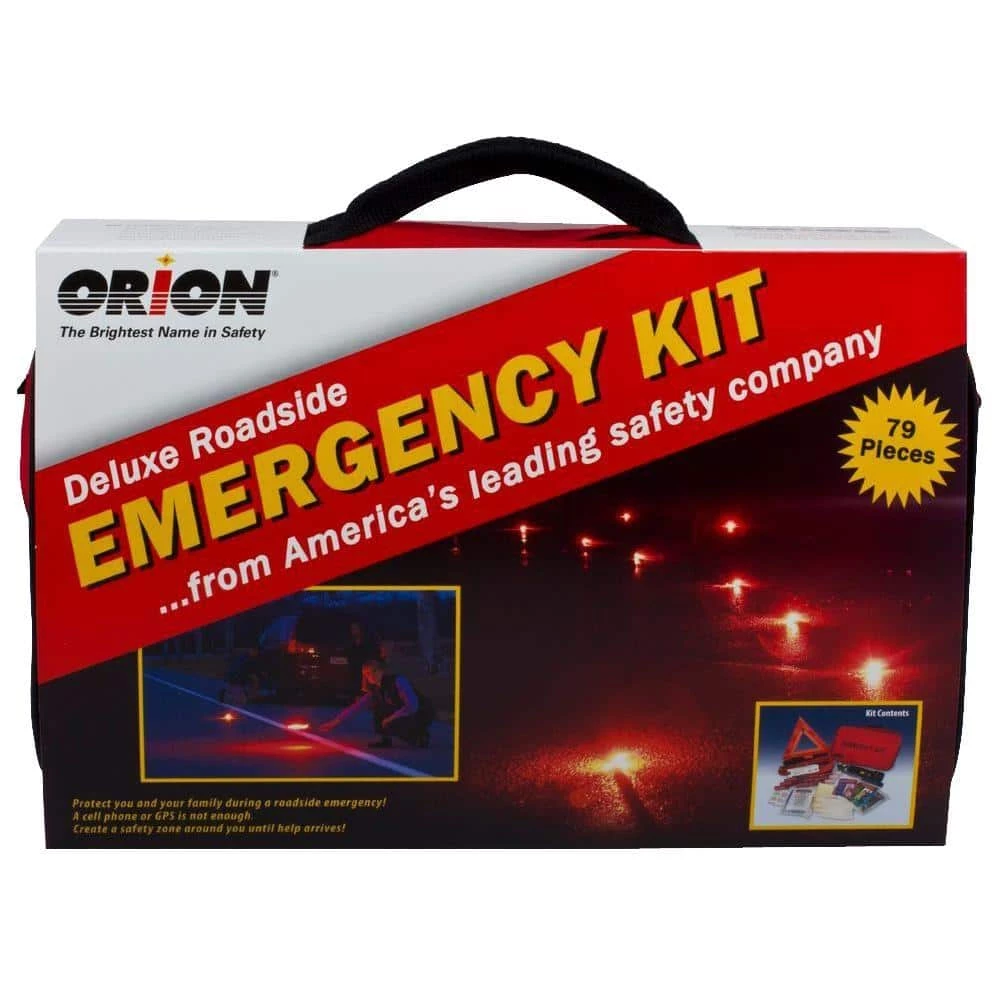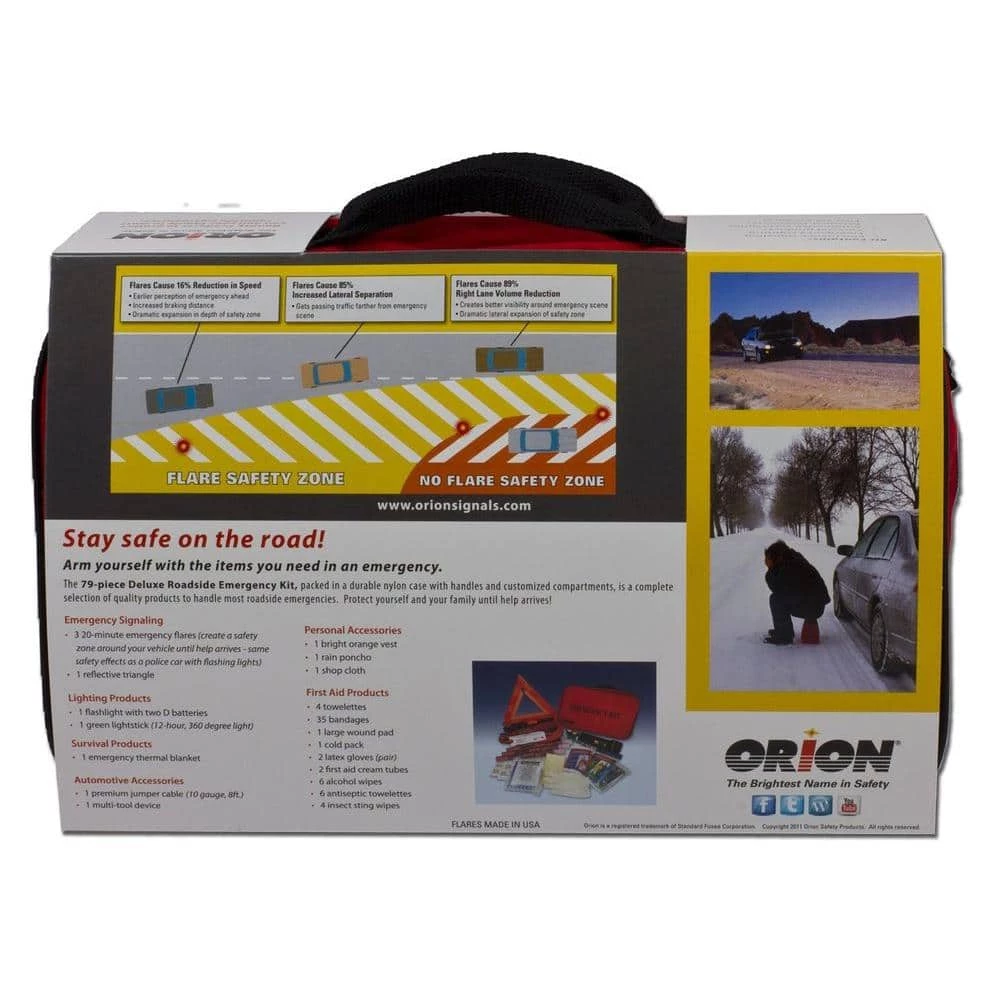 Orion Safety Products is the world’s leading manufacturer of emergency flares and other signaling devices. The Deluxe Roadside Emergency kit comes with a three twenty minute flares, jumper cables, and a first aid kit. The kit comes in a polyester bag that has self adhesive straps attached to the back to secure placement in the trunk or under the seat in the vehicle.