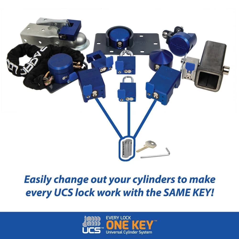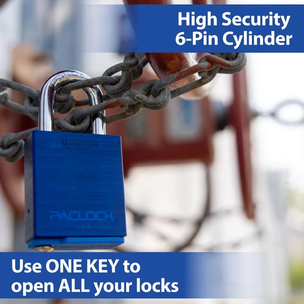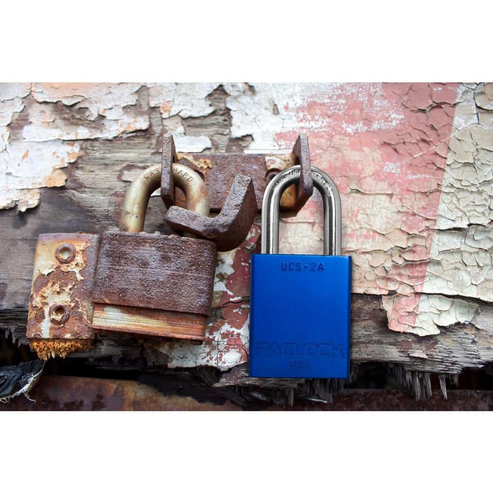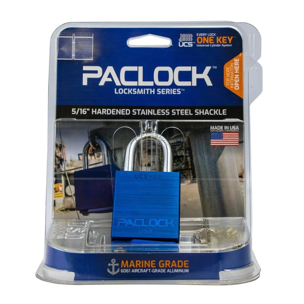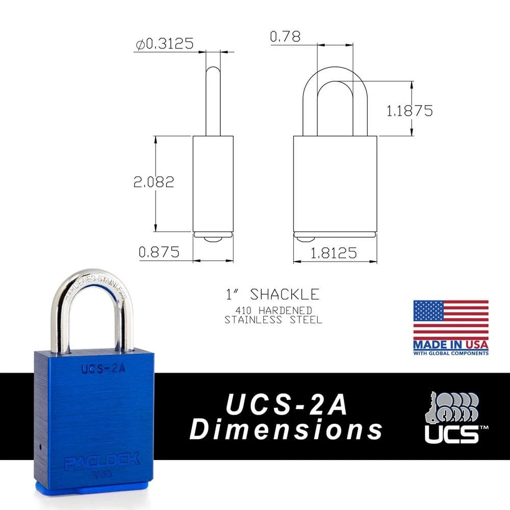 PACLOCK’s Universal Cylinder System (UCS) makes it easy for you to key different padlock styles alike to give you full customization of your lock setup. Easily expand your system to an unlimited number of locks or even start your own master or grand master lock system. The PACLOCK UCS-2A is an all purpose rectangular 6061 aircraft-grade aluminum solid body padlock featuring an industry-first 5/16 in. Dia medium-duty hardened stainless steel shackle that is tough to cut and weather resistant. All brass, aluminum and stainless steel components render the lock rustproof. 6-Pin technology (when most locks only have 4 pins) provides over 20,000 unique key codes and makes duplicate key combinations uncommon, meaning your key number is virtually unique to you. Stainless steel spool and serrated security pins make the lock pick, bump and drill resistant. Dual bar bearing locking and other security features make the lock bypass and shim proof. Includes the PAC-BAND, a silicone cover to protect the cylinder from the elements. Change to a long length shackle in seconds using PACLOCKs modular UCS shackles. CNC machined for U.S. precision and reliability, both the cylinder and lock body exceeds plus or minus 0.003 tolerances for repeatable quality.