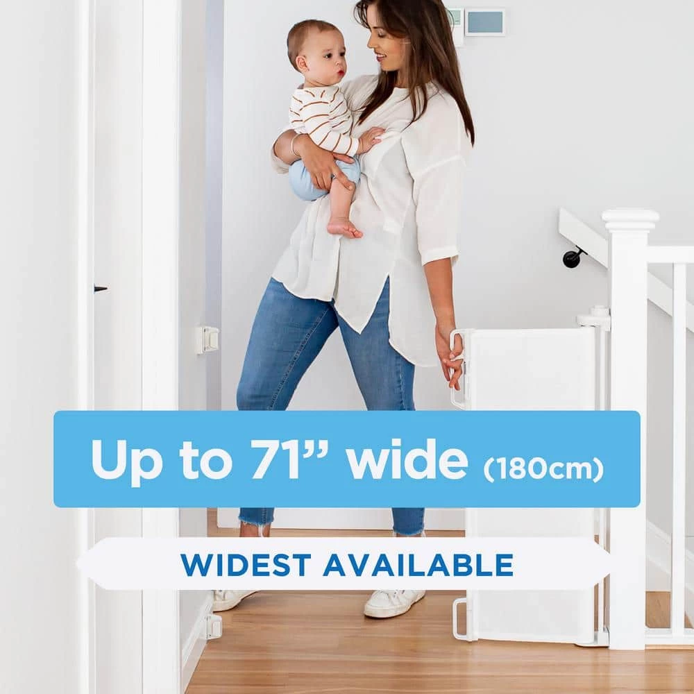 - Retractable design: this extra wide indoor/outdoor retractable gate is a versatile home safety solution, allowing easy use in high traffic areas without the trouble of disassembly and designed to adjust to any door size up to 71 in.