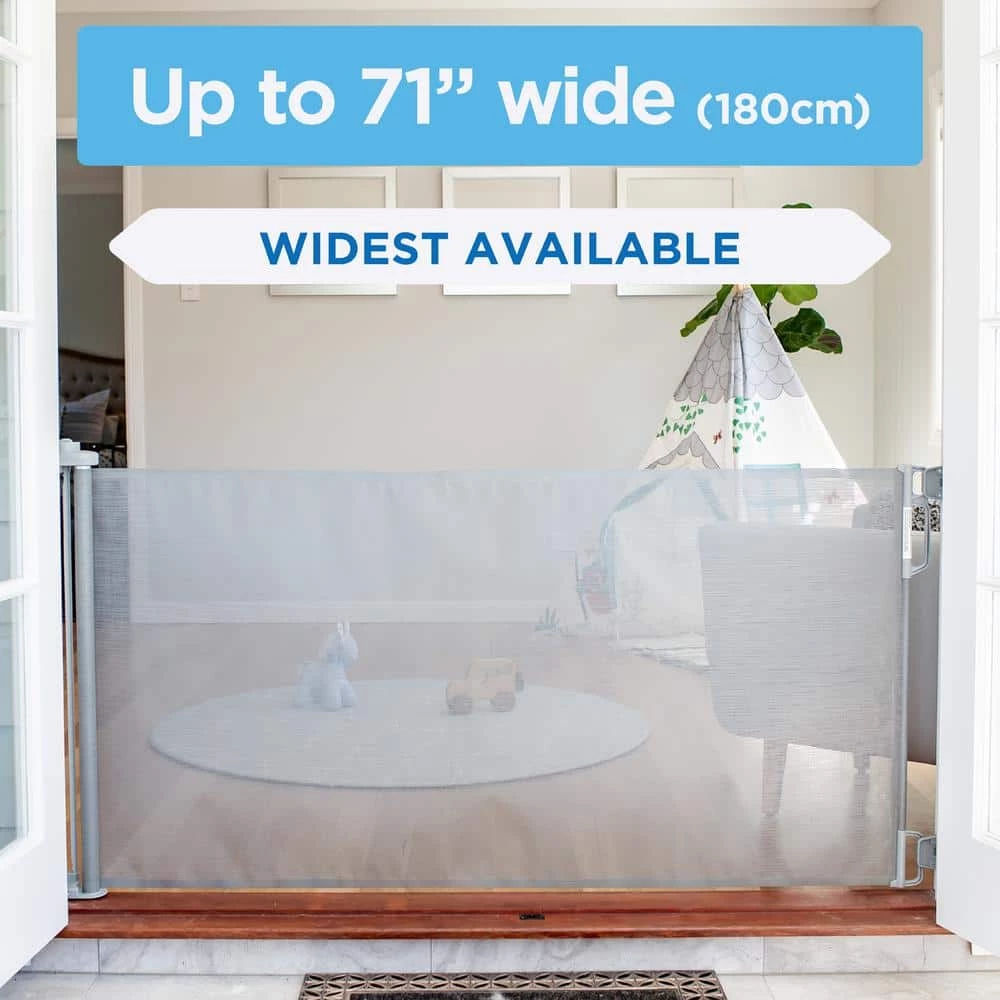- Product details: this outdoor retractable gate extends up to 71 in. wide and is 33 in. tall and includes components for easy installation – screws, catch mounts, wall spacer shims for the baseboards and installation guides