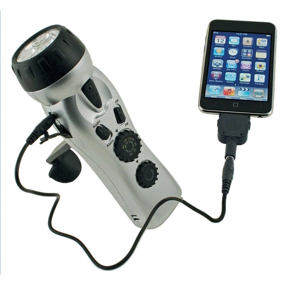 - Emergency Power Station serves as an emergency flashlight, radio, siren and cell phone charger which includes 3 cell phone plugs for iPhone 4s and earlier, USB and Mini-USB