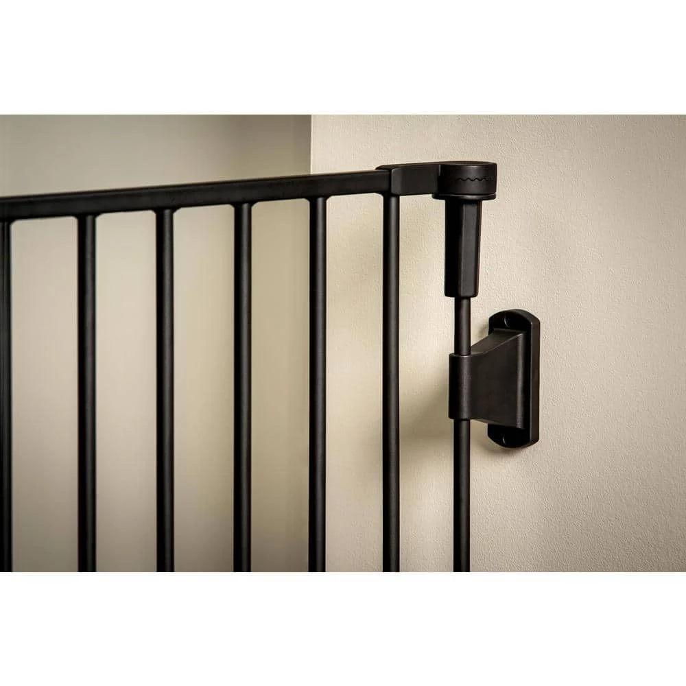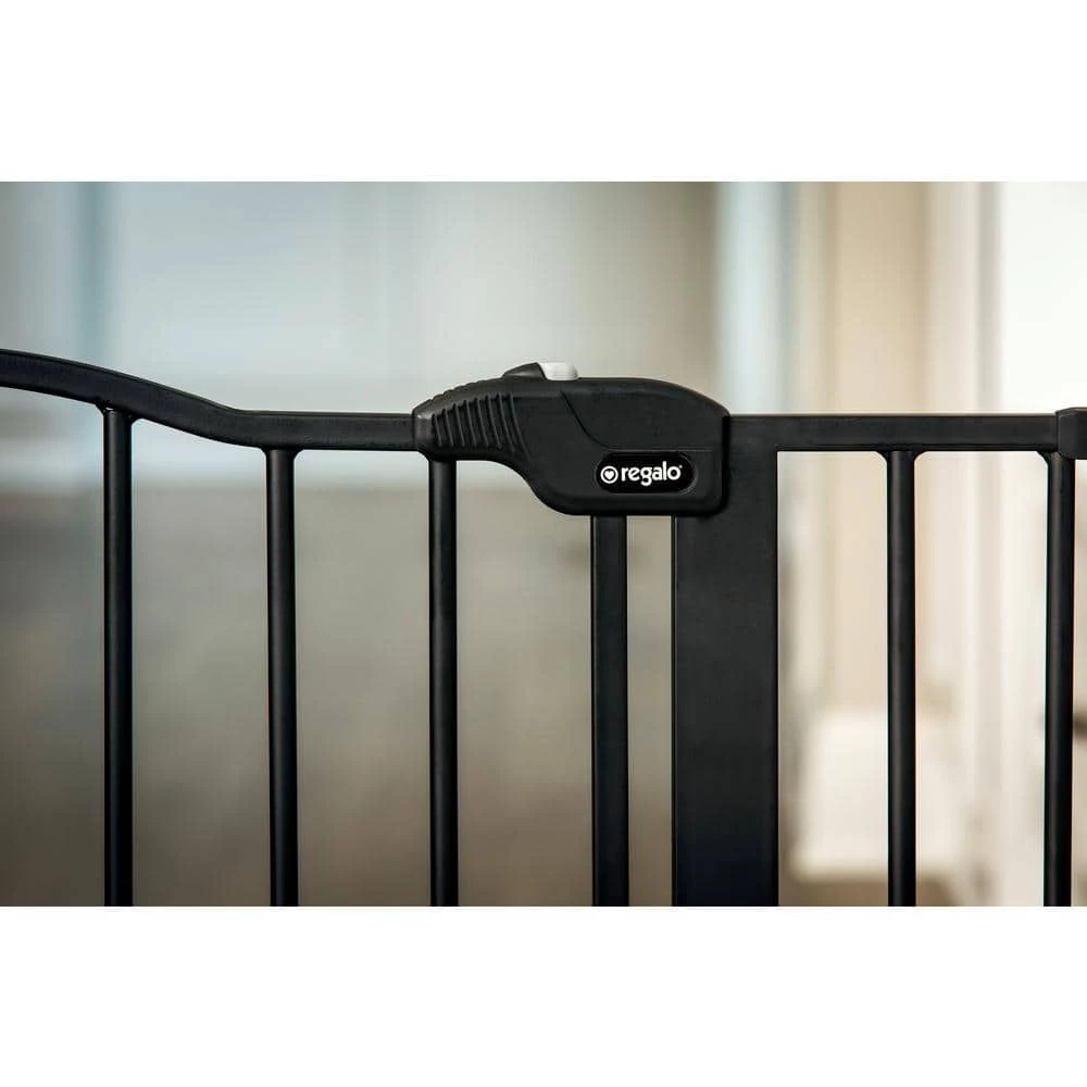 The versatile Regalo Home Decor Super Wide Baby Gate is an essential tool for homes with an open floor plan or unusually shaped or angled openings. The safe and convenient gate stretches to fit a variety of openings and is a unique way to protect both your child and home. Made of an all-steel construction, the black decor gate can be arranged a variety of ways. Spanning to fit odd shaped openings from 56 in. W up to 74.5 in. W. Easily mounting to the wall, the convenient gate features a large walk-through door designed with a 3-lock system for added security.