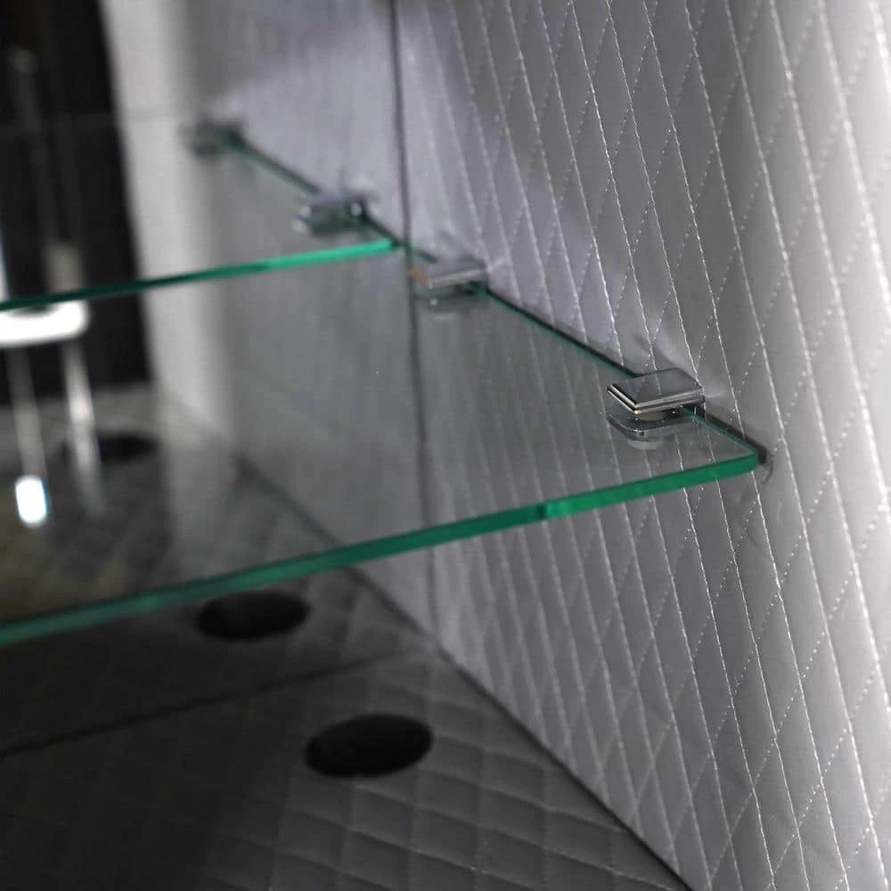 - Premium interior with luxury quilted fabric, mirrored back wall, and a glass shelf