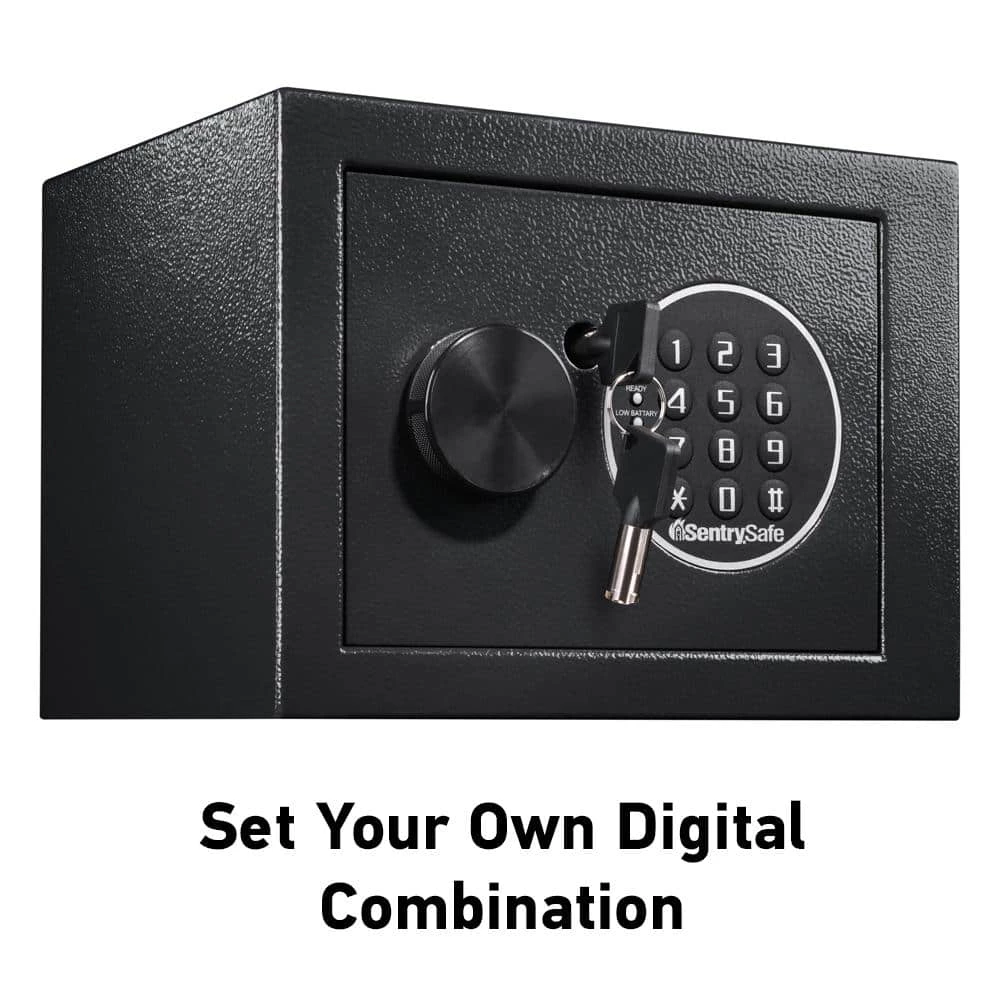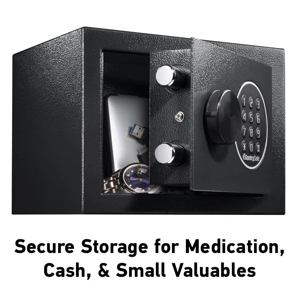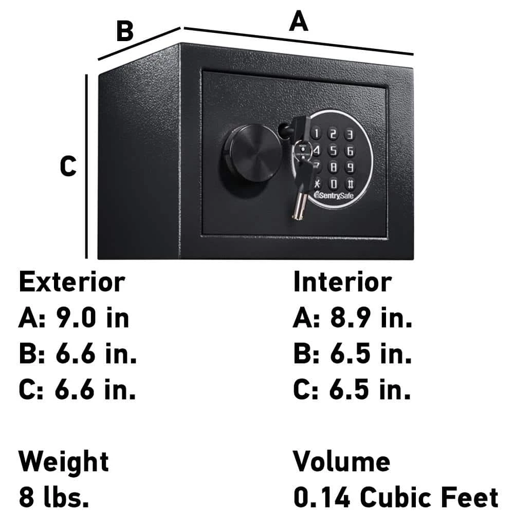 The SentrySafe X014E Security Safe with Digital Keypad features solid steel construction, a programmable digital lock, override key and two live-locking bolts for durable and reliable protection for your valuables. The X014E is the ideal storage solution for all your small irreplaceable items. Exterior: 9.0 in. W x 6.6 in. D x 6.6 in. H; interior: 8.9 in. W x 6.5 in. D x 6.5 in. H; extra small 0.14 cu. ft. capacity; weighs 8.1 lbs.