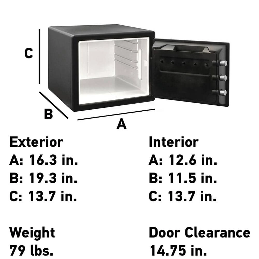 - Exterior: 16.3 in. W x 19.3 in. D x 13.7 in. H; door requires 14.75 in. of clearance to fully open; interior: 12.6 in. W x 11.5 in. D x 9.6 in. H; large 0.81 cubic foot capacity; weighs 79 lbs.