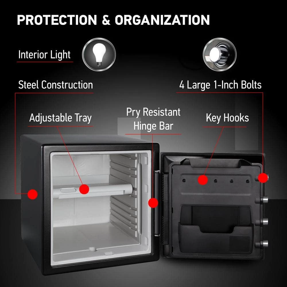 - Set your own digital combination fire safe with secondary locking key for strong security; digital combination safe features four live-locking bolts, steel construction, pry-resistant hinge bar, tray, interior light, and bolt down hardware
