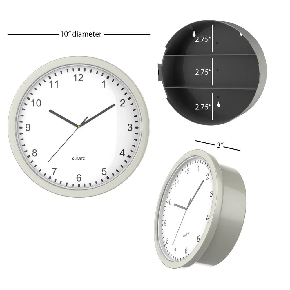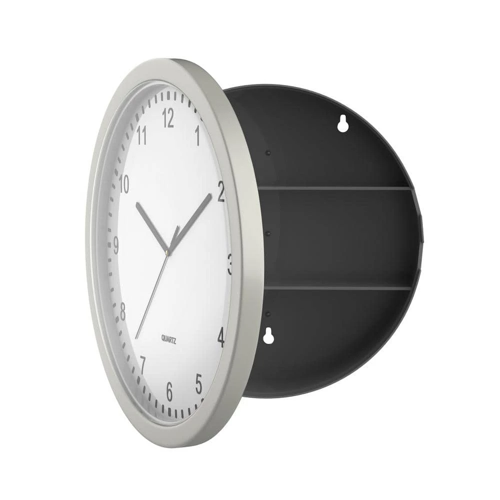 - PRODUCT DETAILS: Dimensions: 10-inch diameter, 3-inch depth. Two dividers within clock create three 2.75-inch-tall storage spaces. Silver. Requires: 1 AA battery (not included), 3 screws for hanging (not included).