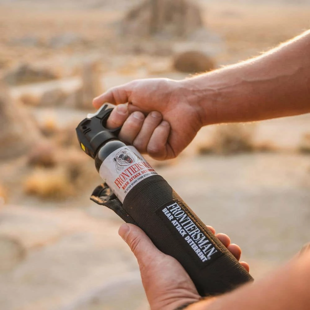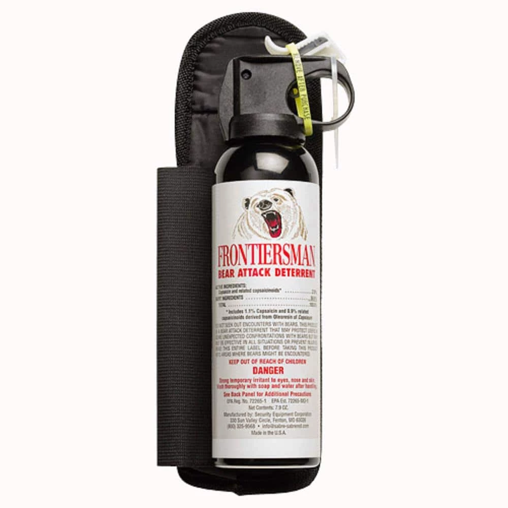 Sabre Frontiersman Bear Spray 7.9 oz with Belt Holster FBAD-04. SABRE Frontiersman Maximum Strength Bear Attack Deterrent with Hip Holster and 3. The Frontiersman is the best animal attack deterrent on the market, now with integrated belt holster for quick delivery. The holster is easily slipped on using a belt providing quick access to your life saving attack deterrent. Designed for bear attacks, the Frontiersman provides a 30 foot range, glow-in-the-dark safety, heavy fog delivery and 2.0% CRC for maximum strength.