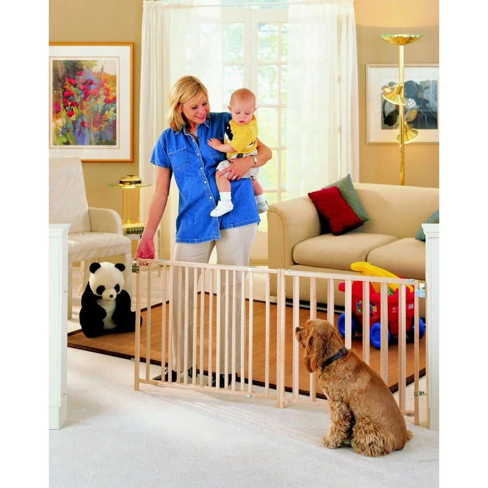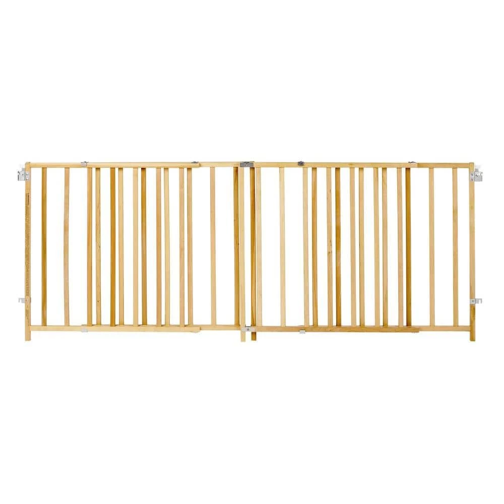 The Extra-Wide Swing Gate by North States is the ideal gate for wide openings. The sturdy wood construction fits seamlessly into any home. Enjoy the ease of one-handed operation and the security of the safety latch design. This gate has no threshold to step over. Includes 4 point steel hardware for mounting as a swing gate. When not in use, remove gate from hardware. Perfect for a wide variety of room openings measuring 60 to 103 in. wide and is 27 in. high. This gate is proudly made in the U.S.A.